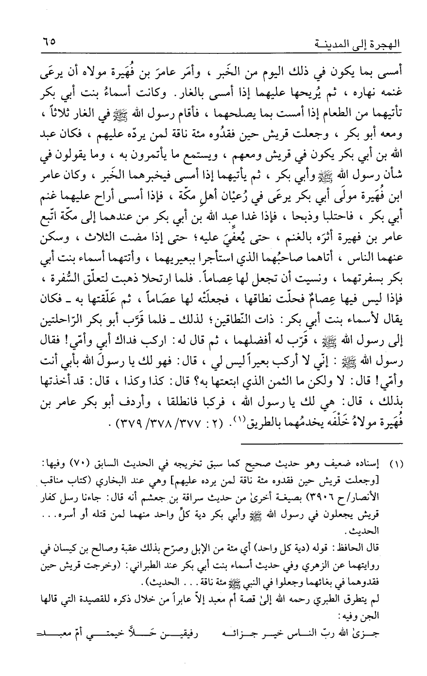 أمسى بما يكون في ذلك اليوم من الخَبر، وأمَر عامرَ بن فُهَيرة مولاه أن يرعَى غنمه نهاره، ثم يُريحها عليهما إذا أمسى بالغار. وكانت أسماءُ بنت أبي بكر تأتيهما من الطعام إذا أمست بما يصلحهما، فأقام رسول الله - صلى الله عليه وسلم - في الغار ثلاثًا، ومعه أبو بكر، وجعلت قريش حين فقدُوه مئة ناقة لمن يردّه عليهم، فكان عبد الله بن أبي بكر يكون في قريش ومعهم، ويستمع ما يأتمرون به، وما يقولون في شأن رسول الله - صلى الله عليه وسلم - وأبي بكر، ثم يأتيهما إذا أمسى فيخبرهما الخَبر، وكان عامر بن فُهَيرة مولَى أبي بكر يرعَى في رُعيان أهلِ مكّة، فإذا أمسى أراح عليهما غنم أبي بكر، فاحتلبا وذبحا، فإذا غدا عبد الله بن أبي بكر من عندهما إلى مكّة اتّبع عامر بن فهيرة أثرَه بالغنم، حتى يُعفِّيَ عليه؛ حتى إذا مضت الثلاث، وسكن عنهما الناس، أتاهما صاحبُهما الذي استأجرا ببعيريهما، وأتتهما أسماء بنت أبي بكر بسفرتهما، ونسيت أن تجعل لها عِصامًا. فلما ارتحلا ذهبت لتعلّق السُّفرة، فإذا ليس فيها عِصامٌ فحلّت نطاقها، فجعلَتْه لها عصَامًا، ثم عَلّقتها به -فكان يقال لأسماء بنت أبي بكر: ذات النّطاقين؛ لذلك -فلما قَرَّب أبو بكر الرّاحلتين إلى رسول الله - صلى الله عليه وسلم -، قَرّب له أفضلهما، ثم قال له: اركب فداك أبي وأمّي! فقال رسول الله - صلى الله عليه وسلم -: إنّي لا أركب بعيرًا ليس لي، قال: فهو لك يا رسولَ الله بأبي أنت وأمّي! قال: لا ولكن ما الثمن الذي ابتعتها به؟ قال: كذا وكذا، قال: قد أخذتها بذلك، قال: هي لك يا رسول الله، فركبا فانطلقا، وأردف أبو بكر عامر بن فُهَيرة مولاهُ خَلْفَه يخدمُهما بالطريق (١). (٢/ ٣٧٧ / ٣٧٨/ ٣٧٩).
