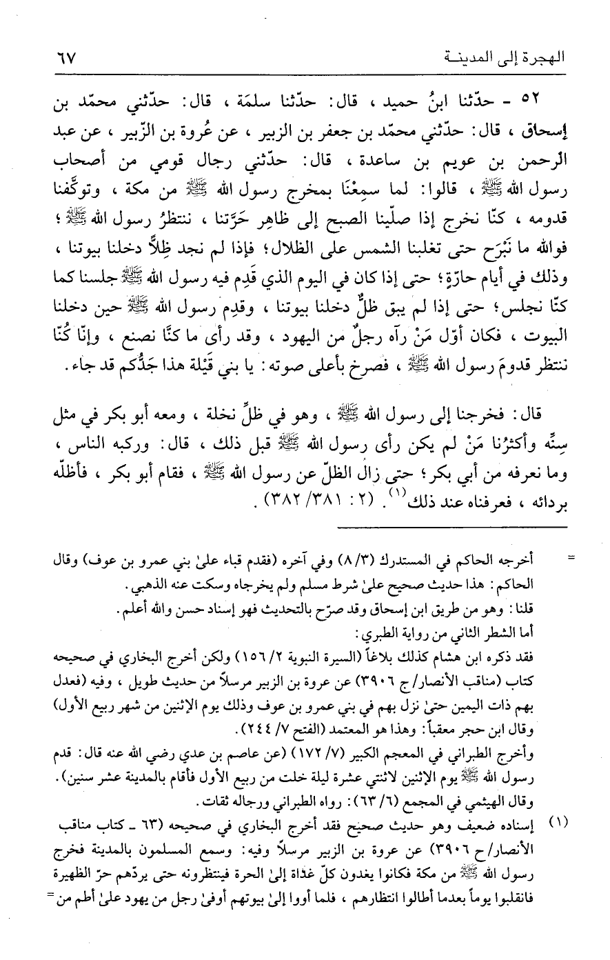 ٥٢ - حدَّثنا ابنُ حميد، قال: حدَّثنا سلمَة، قال: حدّثني محمّد بن إسحاق، قال: حدّثني محمّد بن جعفر بن الزبير، عن عُروة بن الزُّبَيْر، عن عبد الرحمن بن عويم بن ساعدة، قال: حدثني رجال قومي من أصحاب رسول الله - صلى الله عليه وسلم -، قالوا: لما سمِعْنَا بمخرج رسول الله - صلى الله عليه وسلم - من مكة، وتوكَّفنا قدومه، كنّا نخرج إذا صلّينا الصبح إلى ظاهِر حَرَّتنا، ننتظرُ رسول الله - صلى الله عليه وسلم -؛ فوالله ما نَبْرَح حتى تغلبنا الشمس على الظلال؛ فإذا لم نجد ظِلًّا دخلنا بيوتنا، وذلك في أيام حارّةٍ؛ حتى إذا كان في اليوم الذي قَدِم فيه رسول الله - صلى الله عليه وسلم - جلسنا كما كنّا نجلس؛ حتى إذا لم يبق ظلٌّ دخلنا بيوتنا، وقدِم رسول الله - صلى الله عليه وسلم - حين دخلنا البيوت، فكان أوّل مَنْ رآه رجلٌ من اليهود، وقد رأى ما كنَّا نصنع، وإنّا كُنّا ننتظر قدومَ رسول الله - صلى الله عليه وسلم -، فصرخ بأعلى صوته: يا بني قَيلة هذا جَدُّكم قد جاء.