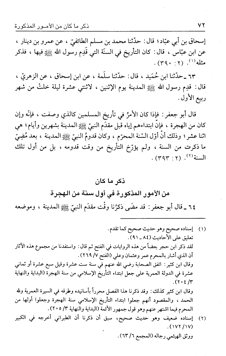 قال أبو جعفر: فإذا كان الأمرُ في تأريخ المسلمين كالذي وصفت، فإنّه وإن كان من الهجرة، فإنّ ابتداءهم إياه قبل مقدَم النبيّ - صلى الله عليه وسلم - المدينة بشهرين وأيام؛ هي اثنا عشر؛ وذلك أنّ أوّل السنة المحرّم، وكان قدومُ النبيّ - صلى الله عليه وسلم - المدينة، بعد مُضِيّ ما ذكرت من السنة، ولم يؤرّخ التأريخ من وقت قدومه، بل من أول تلك السنة (٢). (٢: ٣٩٣).