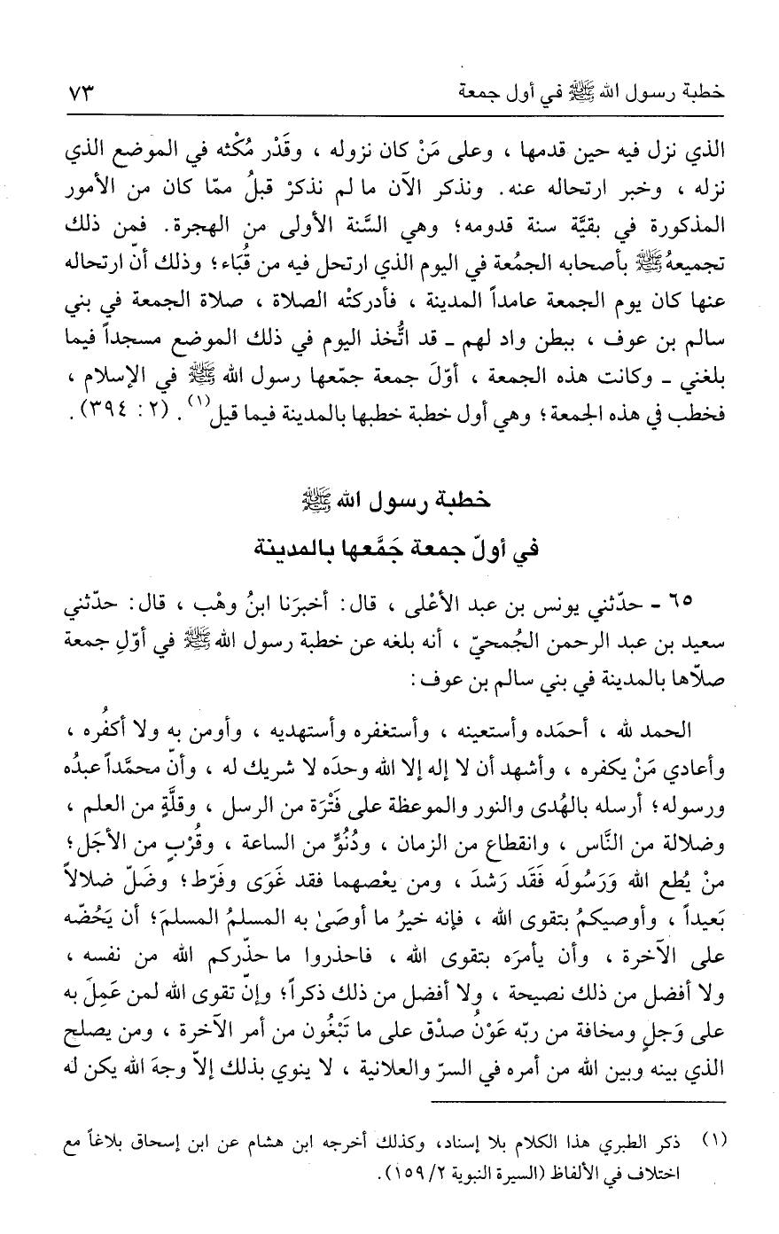 الذي نزل فيه حين قدمها، وعلى مَنْ كان نزوله، وقَدْر مُكْثه في الموضع الذي نزله، وخبر ارتحاله عنه. ونذكر الآن ما لم نذكرْ قبلُ ممّا كان من الأمور المذكورة في بقيَّة سنة قدومه؛ وهي السَّنه الأولى من الهجرة. فمن ذلك تجميعهُ - صلى الله عليه وسلم - بأصحابه الجمُعة في اليوم الذي ارتحل فيه من قُبَاء؛ وذلك أنّ ارتحاله عنها كان يوم الجمعة عامدًا المدينة، فأدركتْه الصلاة، صلاة الجمعة في بني سالم بن عوف، ببطن واد لهم -قد اتُّخذ اليوم في ذلك الموضع مسجدًا فيما بلغني- وكانت هذه الجمعة، أوّلَ جمعة جمّعها رسول الله - صلى الله عليه وسلم - في الإسلام، فخطب في هذه الجمعة، وهي أول خطبة خطبها بالمدينة فيما قيل (١) (٢: ٣٩٤).