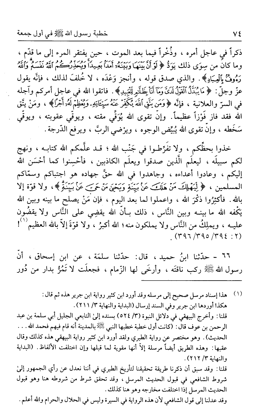 قلنا: وأخرج البيهقي في دلائل النبوة (٣/ ٥٢٤) بسنده إلى التابعي الجليل أبي سلمة بن عبد الرحمن بن عوف قال: (كانت أول خطبة خطبها النبي - صلى الله عليه وسلم - بالمدينة أنه قام فيهم فحمد الله ... الحديث). وهو مختصر عن رواية الطبري ولقد أورد ابن كثير رواية البيهقي هذه كذلك وقال عقبها: وهذه الطريق أيضًا مرسلة إلّا أنها مقوية لما قبلها وإن اختلفت الألفاظ. (البداية والنهاية ٣/ ٢١٢).