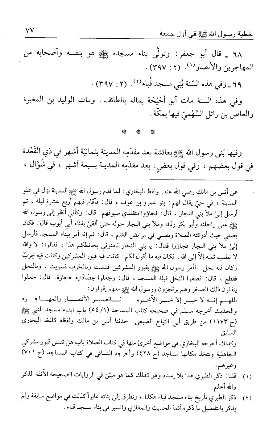 ٦٨ - قال أبو جعفر: وتولَّى بناء مسجده - صلى الله عليه وسلم - هو بنفسه وأصحابه من المهاجرين والأنصار (١). (٢: ٣٩٧).