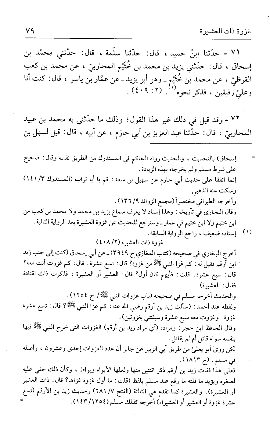 وقال البخاري في تأريخه: وهذا إسناد لا يعرف سماع يزيد بن محمد ولا محمد بن كعب من ابن خثيم ولا ابن خثيم في عمار- وسنرجع للحديث عن غزوة العشيرة بعد الرواية التالية.