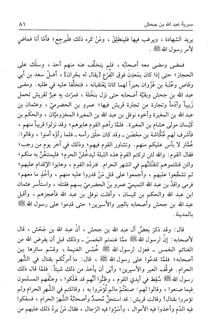 فمضى ومضى معه أصحابُه، فلم يتخلَّف عنه منهم أحد، وسلَك على الحجاز؛ حتى إذا كان بمَعدِنَ فوق الفُرْع [يقال له بحْران]، أضلّ سعد بن أبي وقاص وعُتْبة بن غَزْوان بعيرًا لهما كانا يَعْتقبانه، فتخلَّفا عليه في طلبه. ومضى عبد الله بن جحش وبقيَّة أصحابه حتى نزل بنخْلة، فمرّت بهِ عيرٌ لقريش تحمل زَبيبًا وأدَمًا وتجارة من تجارة قريش فيها؛ عمرو بن الحضرميّ، وعثمان بن عبد الله بن المغيرة وأخوه نوفل بن عبد الله بن المغيرة المخزوميَّان، والحكَم بن كَيسان مولى هشام بن المغيرة. فلمَّا رآهم القوم هابوهم؛ وقد نزلوا قريبًا منهم، فأشرف لهم عُكَّاشة بن محْصَن -وقد كان حلَق رأسه- فلما رأوْه أمنوا، وقالوا: عُمَّار لا بأس عليكم منهم. وتشاور القوم فيهم، وذلك في آخر يوم من رجب؛ فقال القوم: والله لئن تركتم القومَ هذه الليلة ليدخُلنّ الحرم؛ فليمتنعُنَّ به منكم؛ ولئن قتلتموهم لتقتُلنَّهم في الشهر الحرام، فتردّد القوم، وهابوا الإقدام عليهم؛ ثم تشجَّعوا عليهم، وأجمعوا على قتل مَنْ قدروا عليه منهم، وأخْذِ ما معهم؟ فرمى واقدُ بن عبد الله التميميّ عمرو بنَ الحضرميّ بسهم فقتله، واستأسر عثمان بن عبد الله والحكم بن كيسان، وأفلت نوفل بن عبد الله فأعجزهم، وأقبل عبد الله بن جحش وأصحابه بالعِير والأسيرين؛ حتى قدِموا على رسول الله - صلى الله عليه وسلم - بالمدينة.
