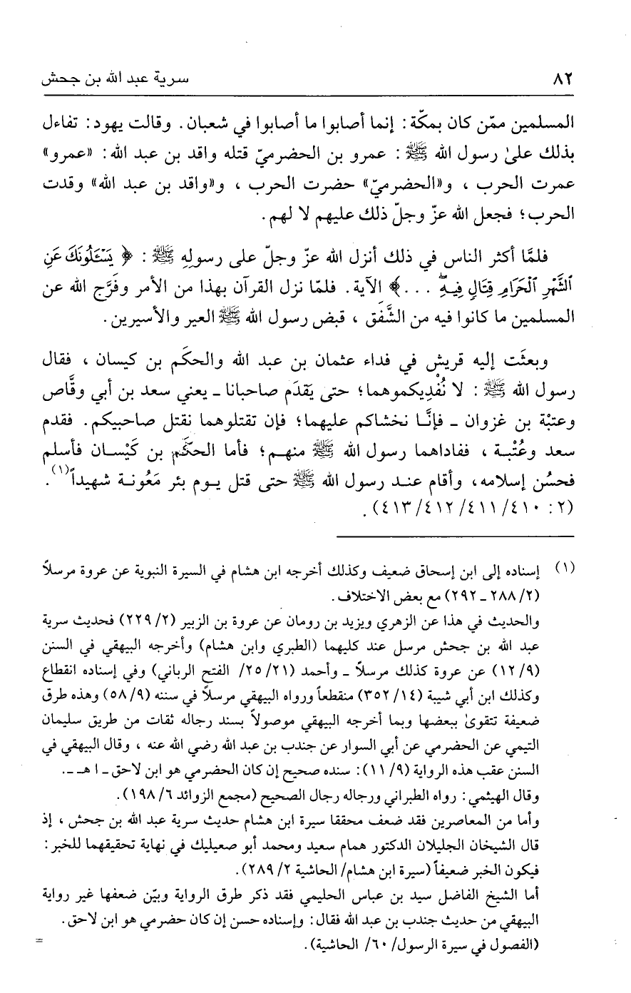 والحديث في هذا عن الزهري ويزيد بن رومان عن عروة بن الزبير (٢/ ٢٢٩) فحديث سرية عبد الله بن جحش مرسل عند كليهما (الطبري وابن هشام) وأخرجه البيهقي في السنن (٩/ ١٢) عن عروة كذلك مرسلًا- وأحمد (٢١/ ٢٥ / الفتح الرباني) وفي إسناده انقطاع وكذلك ابن أبي شيبة (١٤/ ٣٥٢) منقطعًا ورواه البيهقي مرسلًا في سننه (٩/ ٥٨) وهذه طرق ضعيفة تتقوى ببعضها وبما أخرجه البيهقي موصولًا بسند رجاله ثقات من طريق سليمان التيمي عن الحضرمي عن أبي السوار عن جندب بن عبد الله - رضي الله عنه -، وقال البيهقي في السنن عقب هذه الرواية (٩/ ١١): سنده صحيح إن كان الحضرمي هو ابن لاحق- اهـ -.