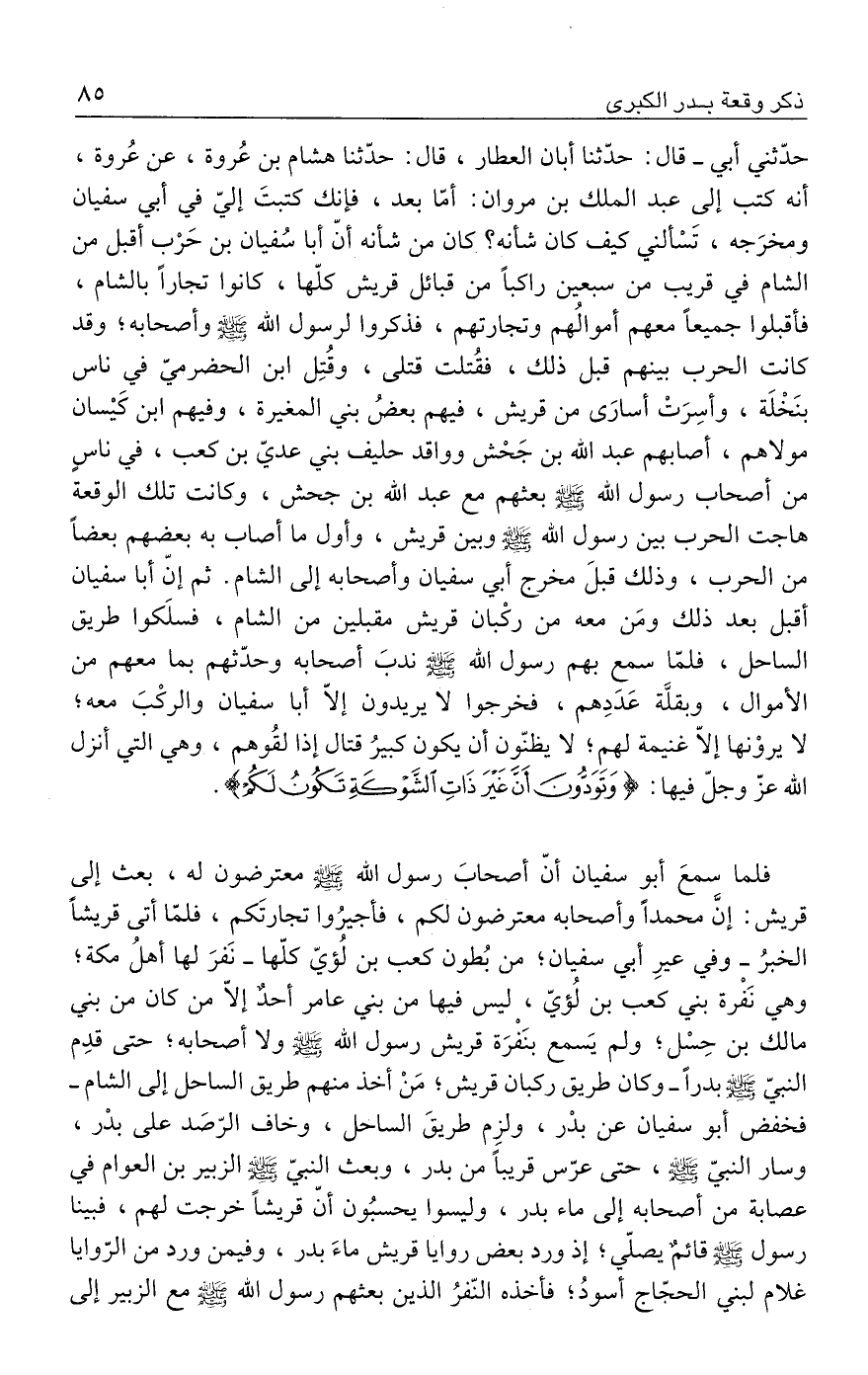 حدّثني أبي- قال: حدَّثنا أبان العطار، قال: حدَّثنا هشام بن عُروة، عن عُروة، أنه كتب إلى عبد الملك بن مروان: أمّا بعد، فإنك كتبتَ إليّ في أبي سفيان ومخرَجه، تَسْألني كيف كان شأنه؟ كان من شأنه أنّ أبا سُفيان بن حَرْب أقبل من الشام في قريب من سبعين راكبًا من قبائل قريش كلّها، كانوا تجارًا بالشام، فأقبلوا جميعًا معهم أموالُهم وتجارتهم، فذكروا لرسول الله - صلى الله عليه وسلم - وأصحابه؛ وقد كانت الحرب بينهم قبل ذلك، فقُتلت قتلى، وقُتِل ابن الحضرميّ في ناس بنَخْلَة، وأسِرَتْ أسارَى من قريش، فيهم بعضُ بني المغيرة، وفيهم ابن كَيسان مولاهم، أصابهم عبد الله بن جَحْش وواقد حليف بني عديّ بن كعب، في ناسٍ من أصحاب رسول الله - صلى الله عليه وسلم - بعثهم مع عبد الله بن جحش، وكانت تلك الوقعة هاجت الحرب بين رسول الله - صلى الله عليه وسلم - وبين قريش، وأول ما أصاب به بعضهم بعضًا من الحرب، وذلك قبلَ مخرج أبي سفيان وأصحابه إلى الشام. ثم إنّ أبا سفيان أقبل بعد ذلك ومَن معه من ركْبان قريش مقبلين من الشام، فسلَكوا طريق الساحل، فلمّا سمع بهم رسول الله - صلى الله عليه وسلم - ندبَ أصحابه وحدّثهم بما معهم من الأموال، وبقلَّة عَدَدِهم، فخرجوا لا يريدون إلّا أبا سفيان والركْبَ معه؛ لا يروْنها إلّا غنيمة لهم؛ لا يظنّون أن يكون كبيرُ قتال إذا لقُوهم، وهي التي أنزل الله عزّ وجلّ فيها: {وَتَوَدُّونَ أَنَّ غَيرَ ذَاتِ الشَّوْكَةِ تَكُونُ لَكُمْ}.