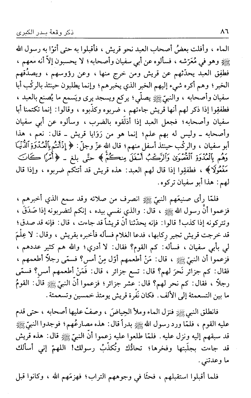 الماء، وأفلت بعضُ أصحاب العبد نحو قريش، فأقبلوا به حتى أتوْا به رسول الله - صلى الله عليه وسلم - وهو في مُعَرّشه، فسألوه عن أبي سفيان وأصحابه؛ لا يحسبون إلّا أنه معهم، فطفِق العبد يحدّثهم عن قريش ومن خرج منها، وعن رؤوسهم، ويصدُقهم الخبر؛ وهم أكره شيء إليهم الخبر الذي يخبرهم؛ وإنما يطلبون حينئذ بالركْب أبا سفيان وأصحابه، والنبيّ - صلى الله عليه وسلم - يصلّي؛ يركع ويسجد يرى ويَسمع ما يُصنع بالعبد، فطفقِوا إذا ذكر لهم أنها قريش جاءتهم، ضربوه وكذّبوه، وقالوا: إنما تكتمنا أبا سفيان وأصحابه؛ فجعل العبد إذا أذلَقوه بالضرب، وسألوه عن أبي سفيان وأصحابه -وليس له بهم علم؛ إنما هو من رَوَايا قريش- قال: نعم، هذا أبو سفيان، والركْب حينئذ أسفل منهم؛ قال الله عزّ وجلّ: {إِذْ أَنْتُمْ بِالْعُدْوَةِ الدُّنْيَا وَهُمْ بِالْعُدْوَةِ الْقُصْوَى وَالرَّكْبُ أَسْفَلَ مِنْكُمْ} حتَّى بلغ- {أَمْرًا كَانَ مَفْعُولًا}، فطفقِوا إذا قال لهم العبد: هذه قريش قد أتتكم ضربوه، وإذا قال لهم: هذا أبو سفيان تركوه.