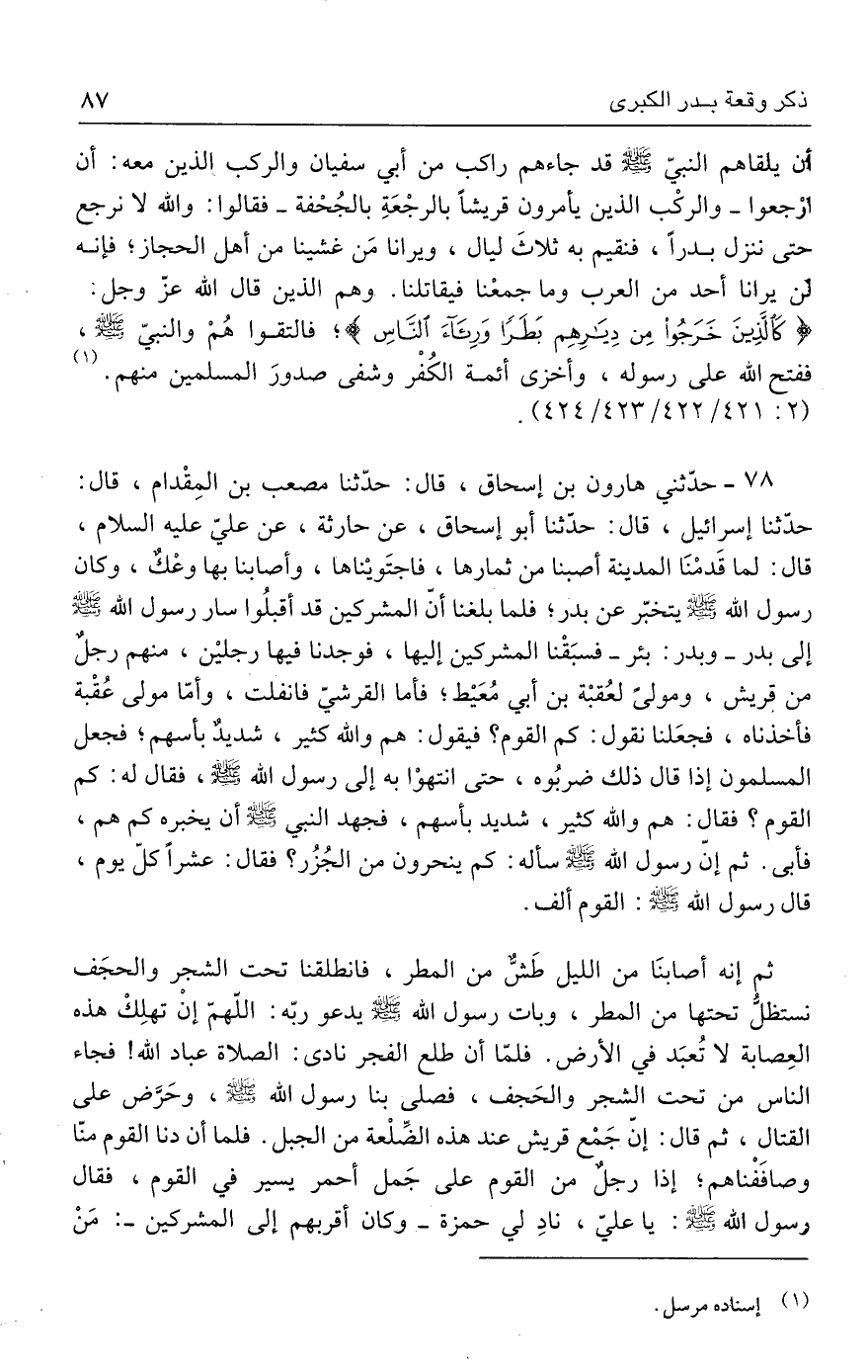 ٧٨ - حدّثني هارون بن إسحاق، قال: حدَّثنا مصعب بن المِقْدام، قال: حدَّثنا إسرائيل، قال: حدَّثنا أبو إسحاق، عن حارثة، عن عليّ - عليه السلام -، قال: لما قَدمْنَا المدينة أصبنا من ثمارها، فاجتَويناها، وأصابنا بها وعْكٌ، وكان رسول الله - صلى الله عليه وسلم - يتخبّر عن بدر؛ فلما بلغنا أنّ المشركين قد أقبلُوا سار رسول الله - صلى الله عليه وسلم - إلى بدر -وبدر: بئر- فسبَقْنا المشركين إليها، فوجدنا فيها رجلين، منهم رجلٌ من قريش، ومولىً لعُقبْة بن أبي مُعَيط؛ فأما القرشيّ فانفلت، وأمّا مولى عُقْبة فأخذناه، فجعَلنا نقول: كم القوم؟ فيقول: هم والله كثير، شديدٌ بأسهم؛ فجعل المسلمون إذا قال ذلك ضربُوه، حتى انتهوْا به إلى رسول الله - صلى الله عليه وسلم -، فقال له: كم القوم؟ فقال: هم والله كثير، شديد بأسهم، فجهد النبي - صلى الله عليه وسلم - أن يخبره كم هم، فأبى. ثم إنّ رسول الله - صلى الله عليه وسلم - سأله: كم ينحرون من الجُزُر؟ فقال: عشرًا كلّ يوم، قال رسول الله - صلى الله عليه وسلم -. القوم ألف.