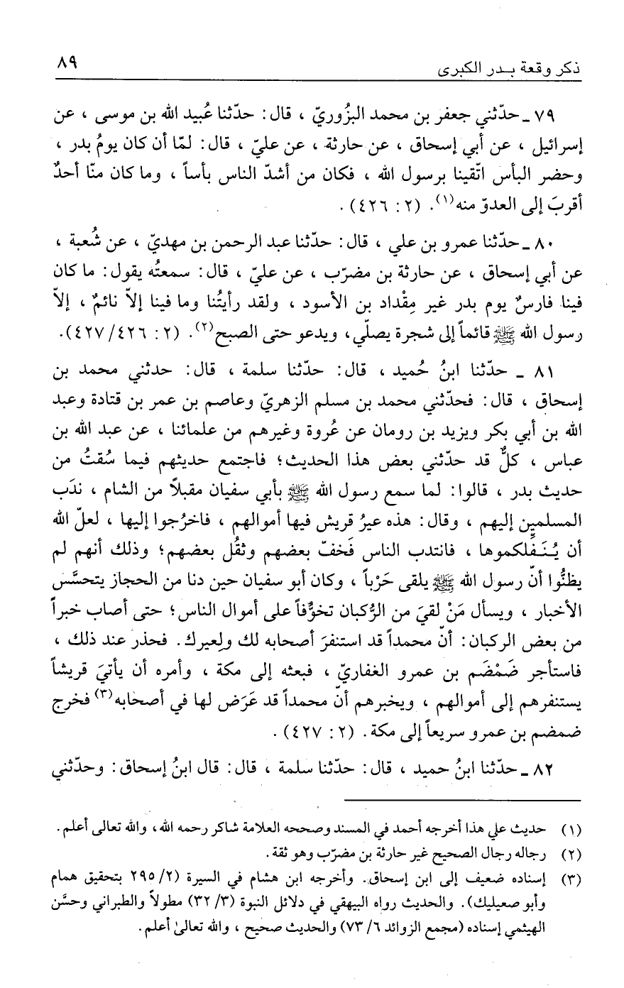 ٧٩ - حدّثني جعفر بن محمد البزُوريّ، قال: حدَّثنا عُبيد الله بن موسى، عن إسرائيل، عن أبي إسحاق، عن حارثة، عن عليّ، قال: لمّا أن كان يومُ بدر، وحضر البأس اتّقينا برسول الله، فكان من أشدّ الناس بأسًا، وما كان منّا أحدٌ أقربَ إلى العدوّ منه (١). (٢: ٤٢٦).