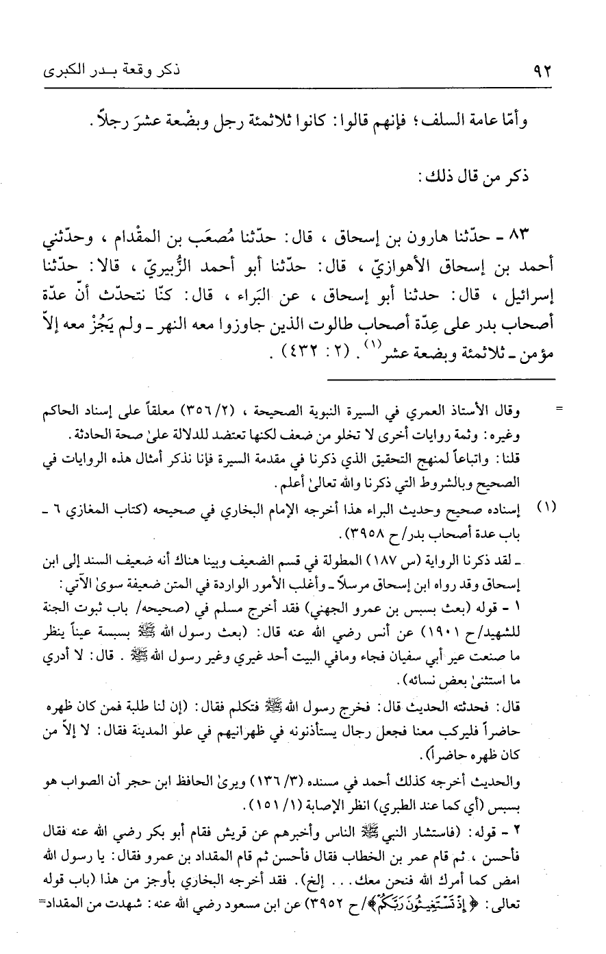 ٨٣ - حدَّثنا هارون بن إسحاق، قال: حدَّثنا مُصعَب بن المقْدام، وحدّثني أحمد بن إسحاق الأهوازيّ، قال: حدَّثنا أبو أحمد الزُّبيريّ، قالا: حدَّثنا إسرائيل، قال: حدَّثنا أبو إسحاق، عن البَراء، قال: كنّا نتحدّث أنّ عدّة أصحاب بدر على عِدّة أصحاب طالوت الذين جاوزوا معه النهر -ولم يَجُزْ معه إلّا مؤمن- ثلاثمئة وبضعة عشر (١). (٢: ٤٣٢).