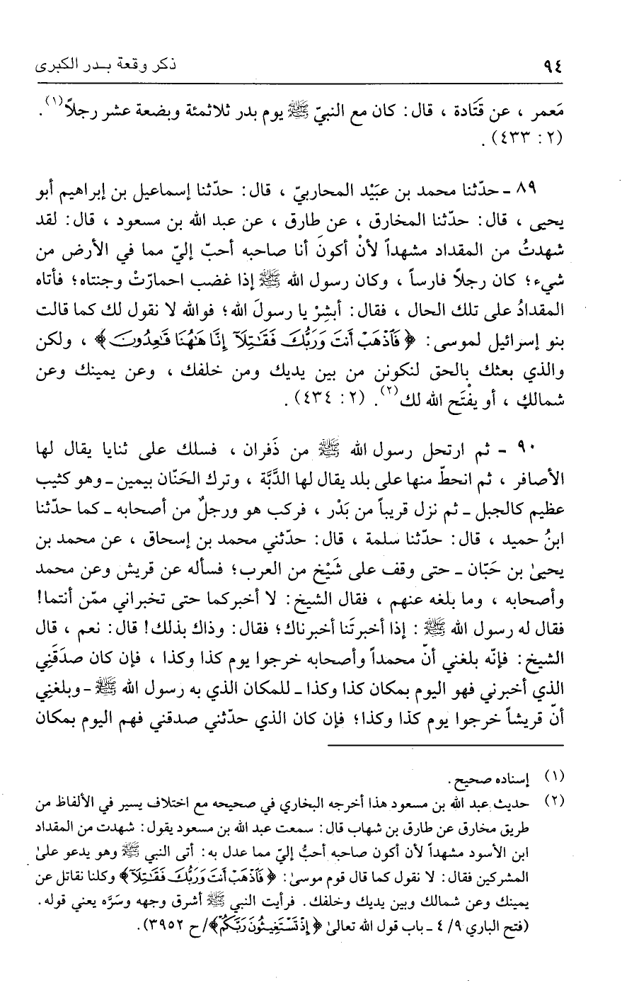 ٨٩ - حدَّثنا محمد بن عبَيد المحاربيّ، قال: حدَّثنا إسماعيل بن إبراهيم أبو يحيى، قال: حدَّثنا المخارق، عن طارق، عن عبد الله بن مسعود، قال: لقد شهدتُ من المقداد مشهدًا لأنْ أكونَ أنا صاحبه أحبّ إليّ مما في الأرض من شيء؛ كان رجلًا فارسًا، وكان رسول الله - صلى الله عليه وسلم - إذا غضب احمارّتْ وجنتاه؛ فأتاه المقدادُ على تلك الحال، فقال: أبشِرْ يا رسولَ الله؛ فوالله لا نقول لك كما قالت بنو إسرائيل لموسى: {فَاذْهَبْ أَنْتَ وَرَبُّكَ فَقَاتِلَا إِنَّا هَاهُنَا قَاعِدُونَ}، ولكن والذي بعثك بالحق لنكونن من بين يديك ومن خلفك، وعن يمينك وعن شمالك، أو يفْتَح الله لك (٢). (٢: ٤٣٤).