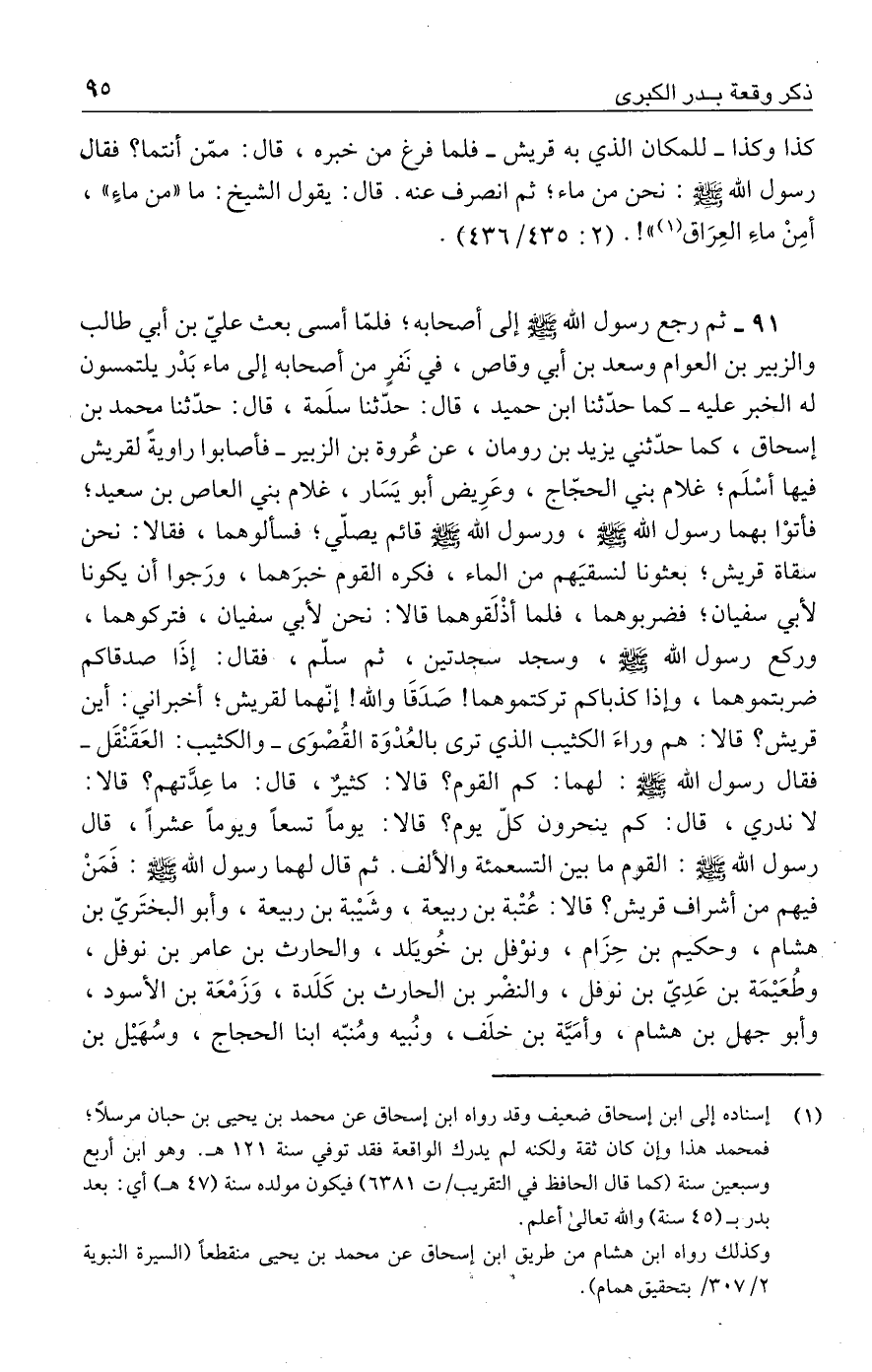 ٩١ - ثم رجع رسول الله - صلى الله عليه وسلم - إلى أصحابه؛ فلمّا أمسى بعث عليّ بن أبي طالب والزبير بن العوام وسعد بن أبي وقاص، في نَفرٍ من أصحابه إلى ماء بَدْر يلتمسون له الخبر عليه -كما حدَّثنا ابن حميد، قال: حدَّثنا سلَمة، قال: حدَّثنا محمد بن إسحاق، كما حدّثني يزيد بن رومان، عن عُروة بن الزبير- فأصابوا راويةً لقريش فيها أسْلَم؛ غلام بني الحجّاج، وعَرِيض أبو يَسَار، غلام بني العاص بن سعيد؛ فأتوْا بهما رسول الله - صلى الله عليه وسلم -، ورسول الله - صلى الله عليه وسلم - قائم يصلّي؛ فسألوهما، فقالا: نحن سقاة قريش؛ بعثونا لنسقيَهم من الماء، فكره القوم خبرَهما، ورَجوا أن يكونا لأبي سفيان؛ فضربوهما، فلما أذْلَقوهما قالا: نحن لأبي سفيان، فتركوهما، وركع رسول الله - صلى الله عليه وسلم -، وسجد سجدتين، ثم سلّم، فقال: إذَا صدقاكم ضربتموهما، وإذا كذباكم تركتموهما! صَدَقَا والله! إنّهما لقريش؛ أخبراني: أين قريش؟ قالا: هم وراءَ الكثيب الذيِ ترى بالعُدْوَة القُصْوَى -والكثيب: العَقَنْقَل- فقال رسول الله - صلى الله عليه وسلم -: لهما: كم القوم؟ قالا: كثيرٌ، قال: ما عِدَّتهم؟ قالا: لا ندري، قال: كم ينحرون كلّ يوم؟ قالا: يومًا تسعًا ويومًا عشرًا، قال رسول الله - صلى الله عليه وسلم -: القوم ما بين التسعمئة والألف. ثم قال لهما رسول الله - صلى الله عليه وسلم -: فَمَنْ فيهم من أشراف قريش؟ قالا: عُتْبة بن ربيعة، وشَيبة بن ربيعة، وأبو البختَريّ بن هشام، وحكيم بن حِزَام، ونوْفل بن خُويَلد، والحارث بن عامر بن نوفل، وطُعَيمَة بن عَدِيّ بن نوفل، والنضْر بن الحارث بن كَلَدة، وَزَمْعَة بن الأسود، وأبو جهل بن هشام، وأمَيّة بن خلَف، ونُبيه ومُنبّه ابنا الحجاج، وسُهَيل بن