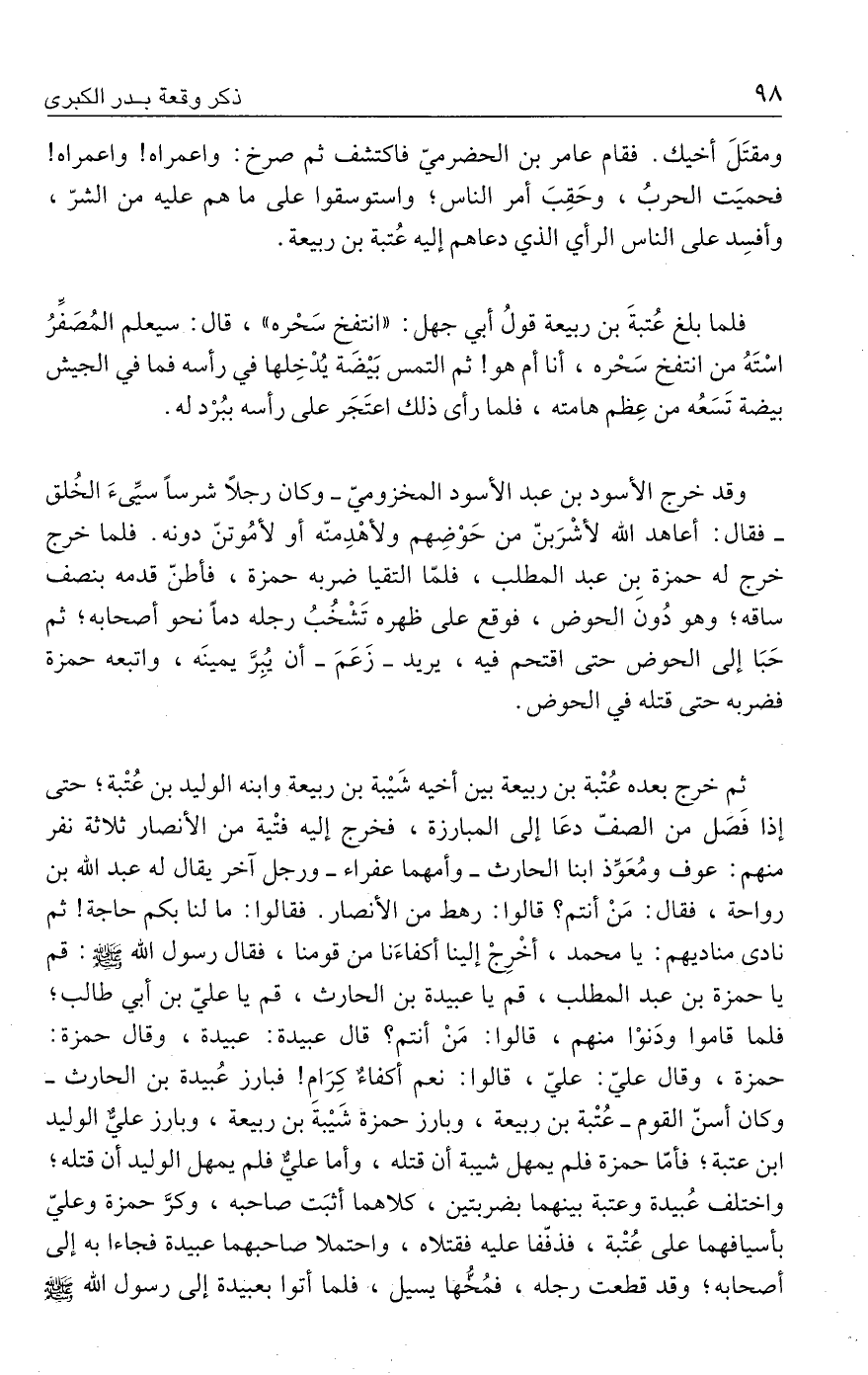 ثم خرج بعده عُتْبة بن ربيعة بين أخيه شَيبة بن ربيعة وابنه الوليد بن عُتْبة؛ حتى إذا فَصَل من الصفّ دعَا إلى المبارزة، فخرج إليه فتْية من الأنصار ثلاثة نفر منهم: عوف ومُعَوِّذ ابنا الحارث -وأمهما عفراء- ورجل آخر يقال له عبد الله بن رواحة، فقال: مَنْ أنتم؟ قالوا: رهط من الأنصار. فقالوا: ما لنا بكم حاجة! ثم نادى مناديهم: يا محمد، أخْرِجْ إلينا أكفاءَنا من قومنا، فقال رسول الله - صلى الله عليه وسلم -: قم يا حمزة بن عبد المطلب، قم يا عبيدة بن الحارث، قم يا عليّ بن أبي طالب؛ فلما قاموا ودَنوْا منهم، قالوا: مَنْ أنتم؟ قال عبيدة: عبيدة، وقال حمزة: حمزة، وقال عليّ: عليّ، قالوا: نعم أكفاءٌ كِرَام! فبارز عُبيدة بن الحارث -وكان أسنّ القوم- عُتْبة بن ربيعة، وبارز حمزةُ شَيبةَ بن ربيعة، وبارز عليٌّ الوليدَ بن عتبة؛ فأمّا حمزة فلم يمهل شيبة أن قتله، وأما عليٌّ فلم يمهل الوليد أن قتله؛ واختلف عُبيدة وعتبة بينهما بضربتين، كلاهما أثبَت صاحبه، وكرَّ حمزة وعليّ بأسيافهما على عُتْبة، فذفّفا عليه فقتلاه، واحتملا صاحبهما عبيدة فجاءا به إلى أصحابه؛ وقد قطعت رجله، فمُخُّها يسيل، فلما أتوا بعبيدة إلى رسول الله - صلى الله عليه وسلم -