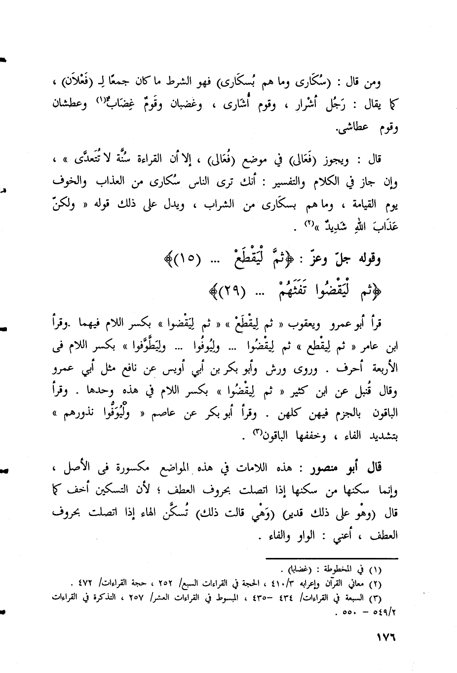 ومن قال: (سُكَارى وما هم بُسكَارى) فهو الشرط ما كان جمعًا لـ (فَعْلاَن) ، كما يقال: رَجُل أشْرار، وقوم أشَارى، وغضبان وقَوقٌ غِضَاب" وعطشان وقوم عطاشى.