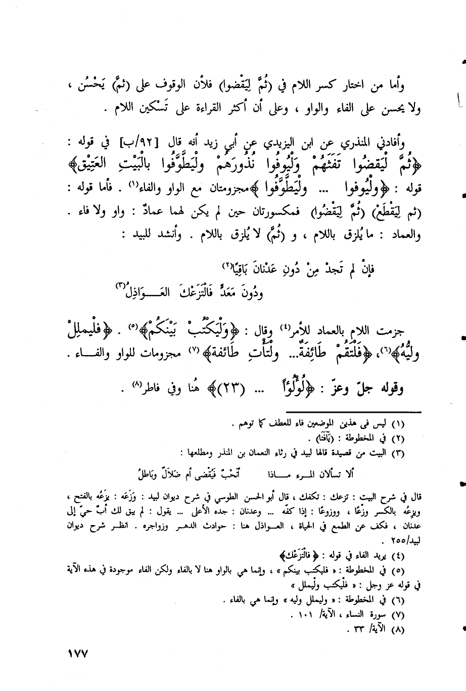 وقال: (وَلْيَكتبْ بَيْنَكُمْ) . (فلْيملِلْ وليُّهُ) ، (فَلتقُمْ طَائِفَة. . . ولتأتِ طائفة) مجزومات للواو والفاء.