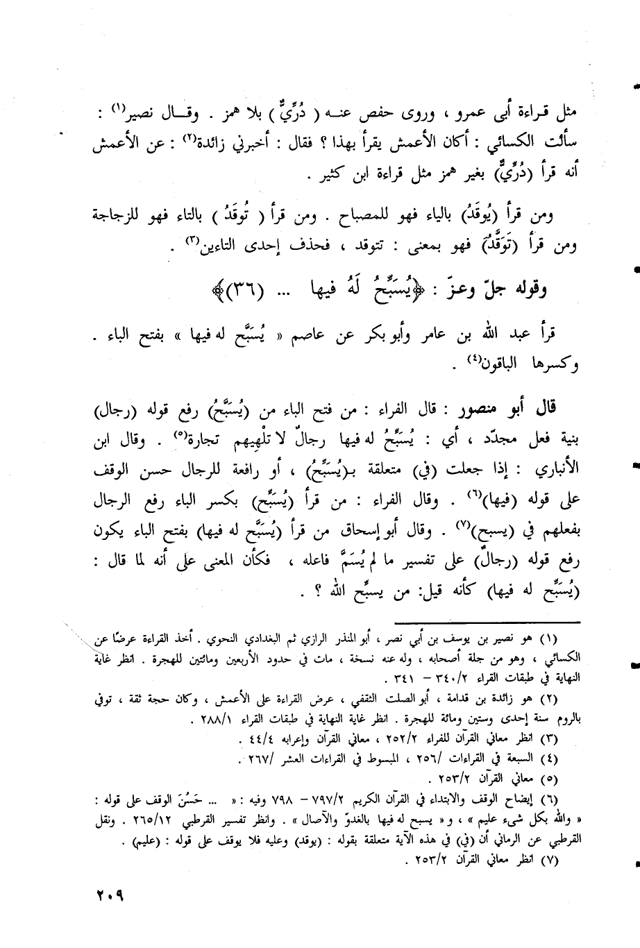 قال أبو منصور: قال الفراء: من فتح الباء من (يُسَبَّحُ) رفع قوله (رِجَالٌ)