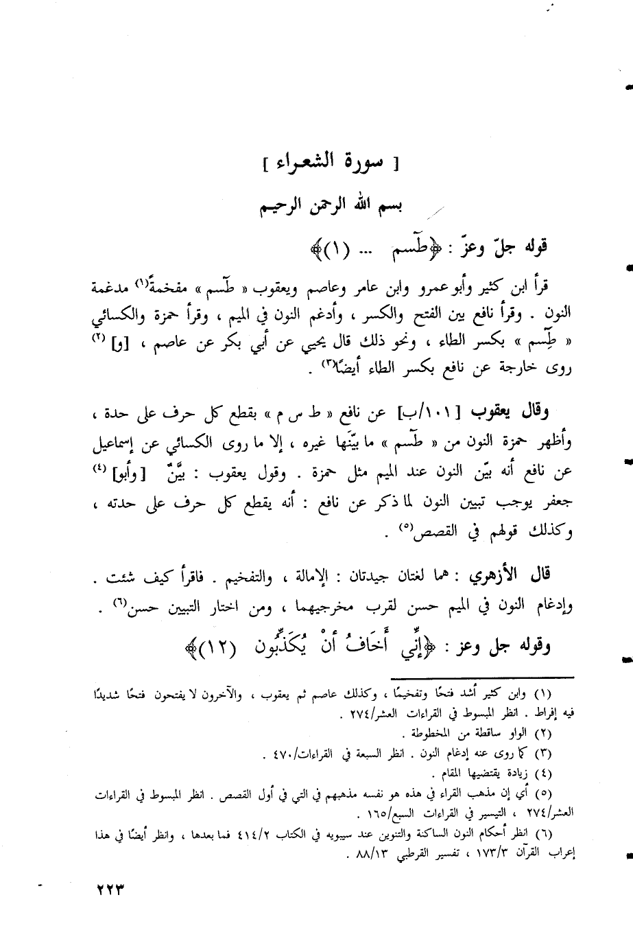 وأظهر حمزة النون من (طَسم) ما بيَّنَها غيره، إلا ما روى الكسائي عن إسماعيل عن نافع أنه بيّن النون عند الميم مثل حمزة.