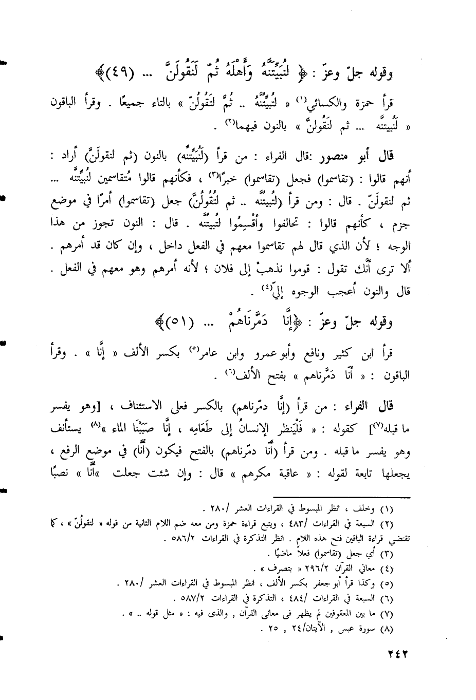 قال أبو منصور: قال الفراء: مَنْ قَرَأَ (لَنُبَيِّتَنَّهُ) بالنون (ثُمَّ لَنَقُولَنَّ)