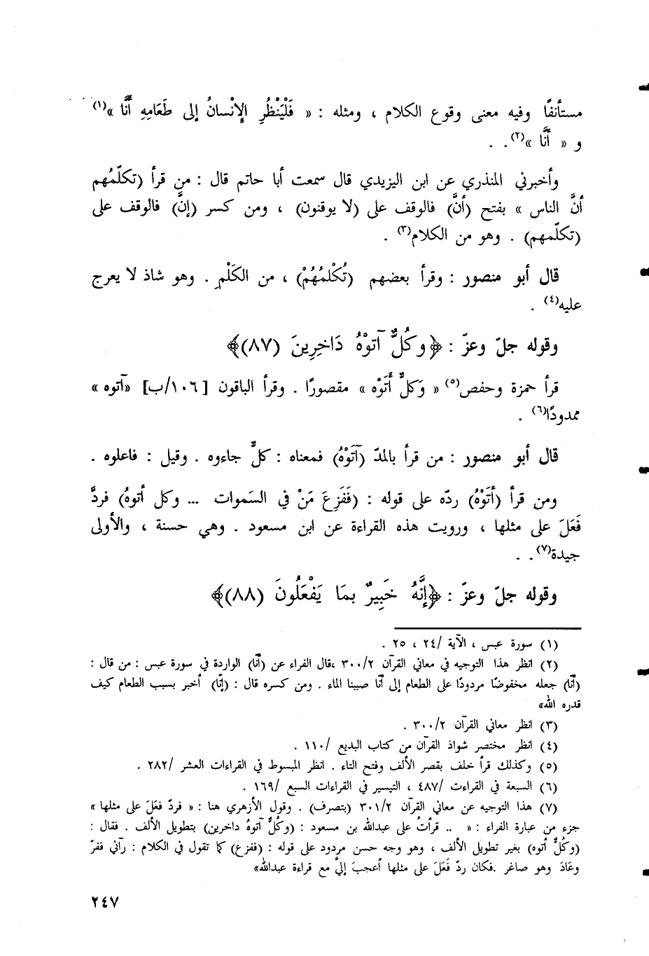 قال أبو منصور: مَنْ قَرَأَ بالمدِّ (آتَوْهُ) فمعناه: كل جاءوه.