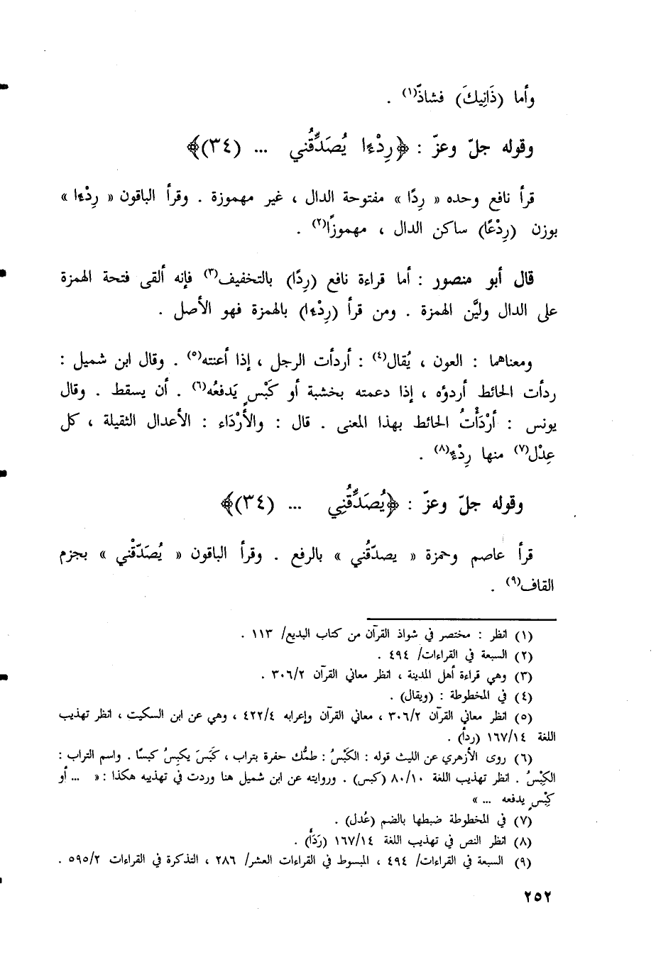 وَمَنْ قَرَأَ (رِدْءًا) بالهمزة فهو الأصل.