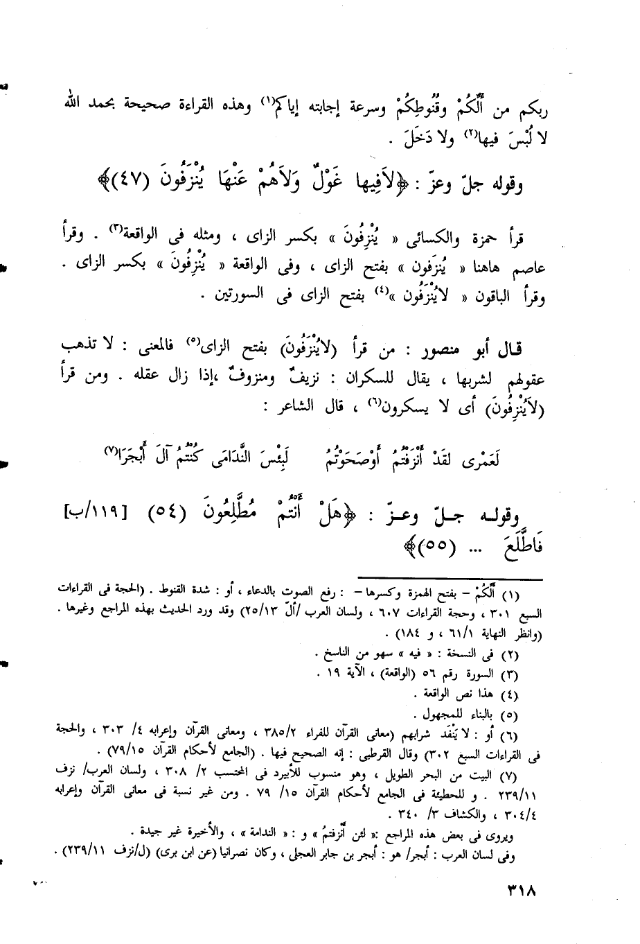 ومن قرأ (لا يُنْزِفُونَ) أى لا يسكرون،