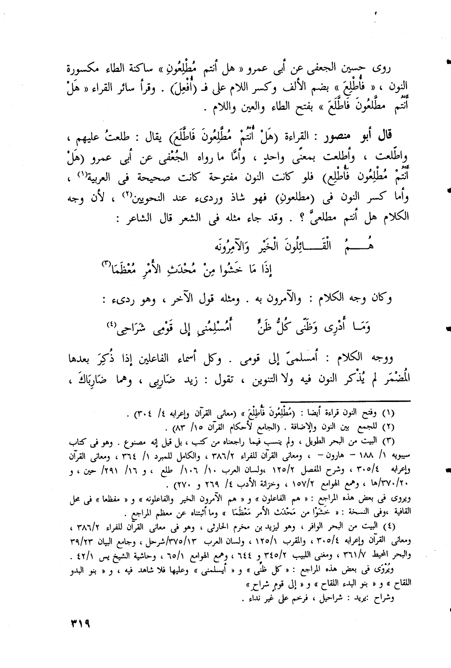 روى حسين الجعفي عن أبي عمرو (هل أنتم مُطْلِعُونِ) ساكنة الطاء مكسورة