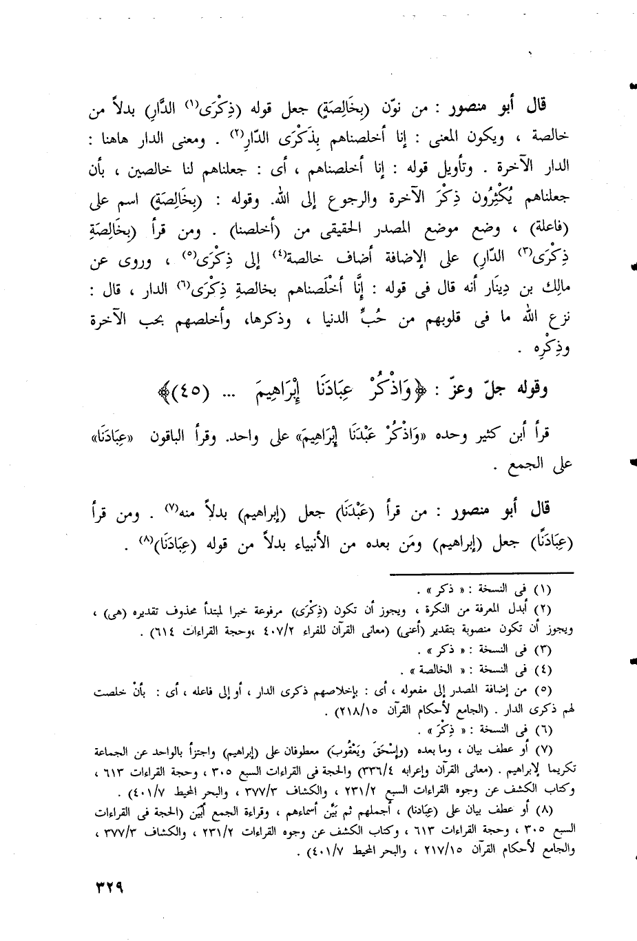 قال أبو منصور: مَنْ قَرَأَ (عَبْدَنَا) جعل (إبراهيم) بدلاً منه.