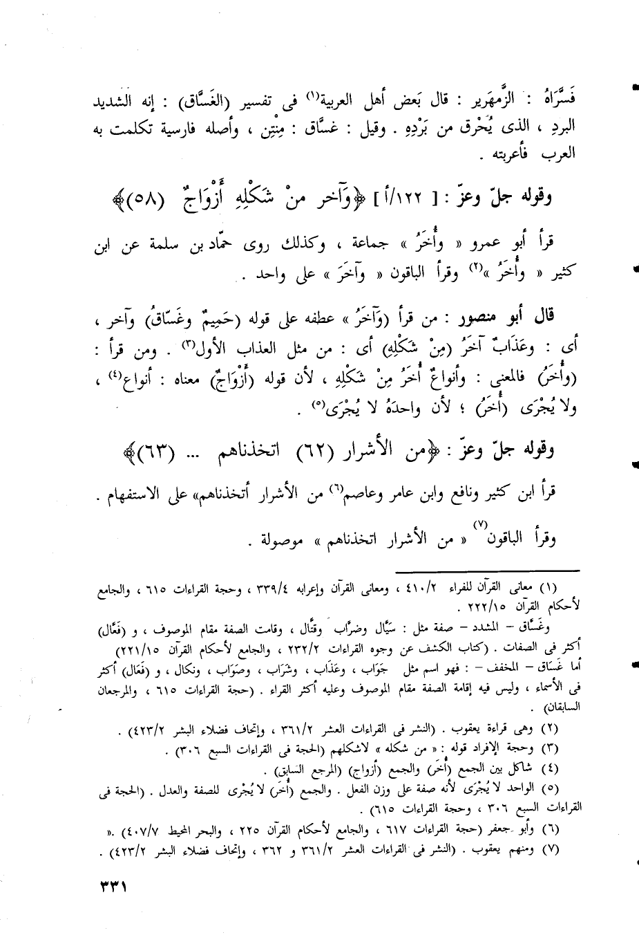 قال أبو منصور: مَنْ قَرَأَ (وَآخَرُ) عطفه على قوله (حَمِيمٌ وغَسّاقُ) وَآخر،