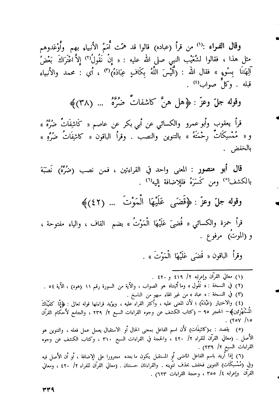 قرأ يعقوب وأبو عمرو والكسائي عن أبي بكر عن عاصم (كَاشِفَاتٌ ضُرَّهُ)