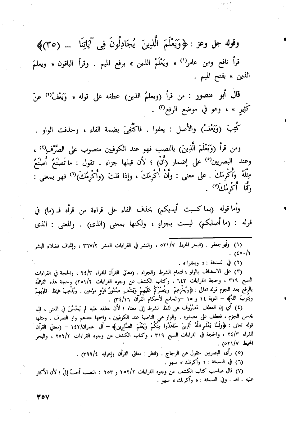 قال أبو منصور: مَنْ قَرَأَ (وَيَعْلَمُ الَّذِينَ) عطفه على قوله (وَيَعْفُ عن كَثِيرٍ) ، وهو في موضع الرفع.