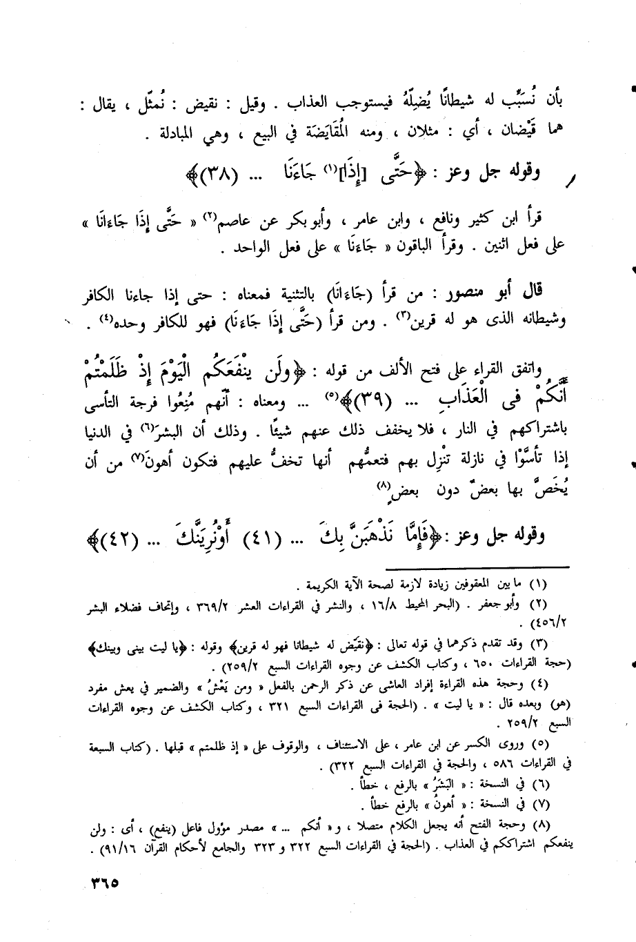 قال أبو منصور: مَنْ قَرَأَ (جَاءَانَا) بالتثنية فمعناه: حتى إذا جاءنا الكافر