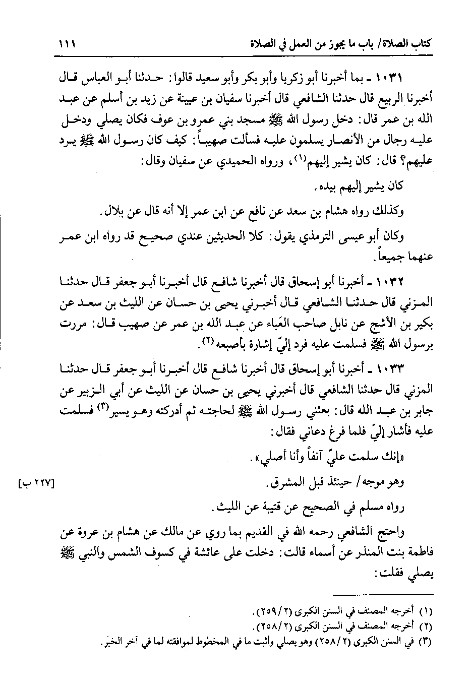 1 @1031 - بما أخبرنا أبو زكريا وأبو بكر وأبو سعيد قالوا : حدثنا أبو العباس قال اخبرنا الربيع قال حدثنا الشافعي قال أخبرنا سفيان بن عيينة عن زيد بن اسلم عن عبد الله بن عمر قال : دخل رسول الله صلى الله عليه وسلم مسجد بني عمرو بن عوف فكان يصلي ودخل عليه رجال من الأنصار يسلمون عليه فسألت صهيبا : كيف كان رسول الله صلى الله عليه وسلم يرد عليهم ؟ قال : كان يشير إليهم ، ورواه الحميد عين سفيان وقال : كان يشير إليهم بيده.