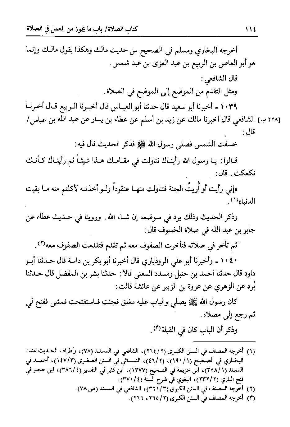 1039 - أخبرنا أبو سعيد قال حدثنا أبو العباس قال اخبرنا الربيع قال اخبرنا الشافعي قال اخبرنا مالك عن زيد بن اسلم عن عطاء بن يسار عن عبد الله بن عباس قال : خسفت الشمس فصلى رسول الله صلى الله عليه وسلم فذكر الحديث قال فيه : قالوا : يا رسول الله رأيناك تناولت في مقامك هذا شيئا ثم رأيناك كأنك تكعكت . قال : إني رأيت أو أريت الجنة فتناولت منها عنقودا ولو اخذته لأكلتم منه ما بقيت الدنيا.
