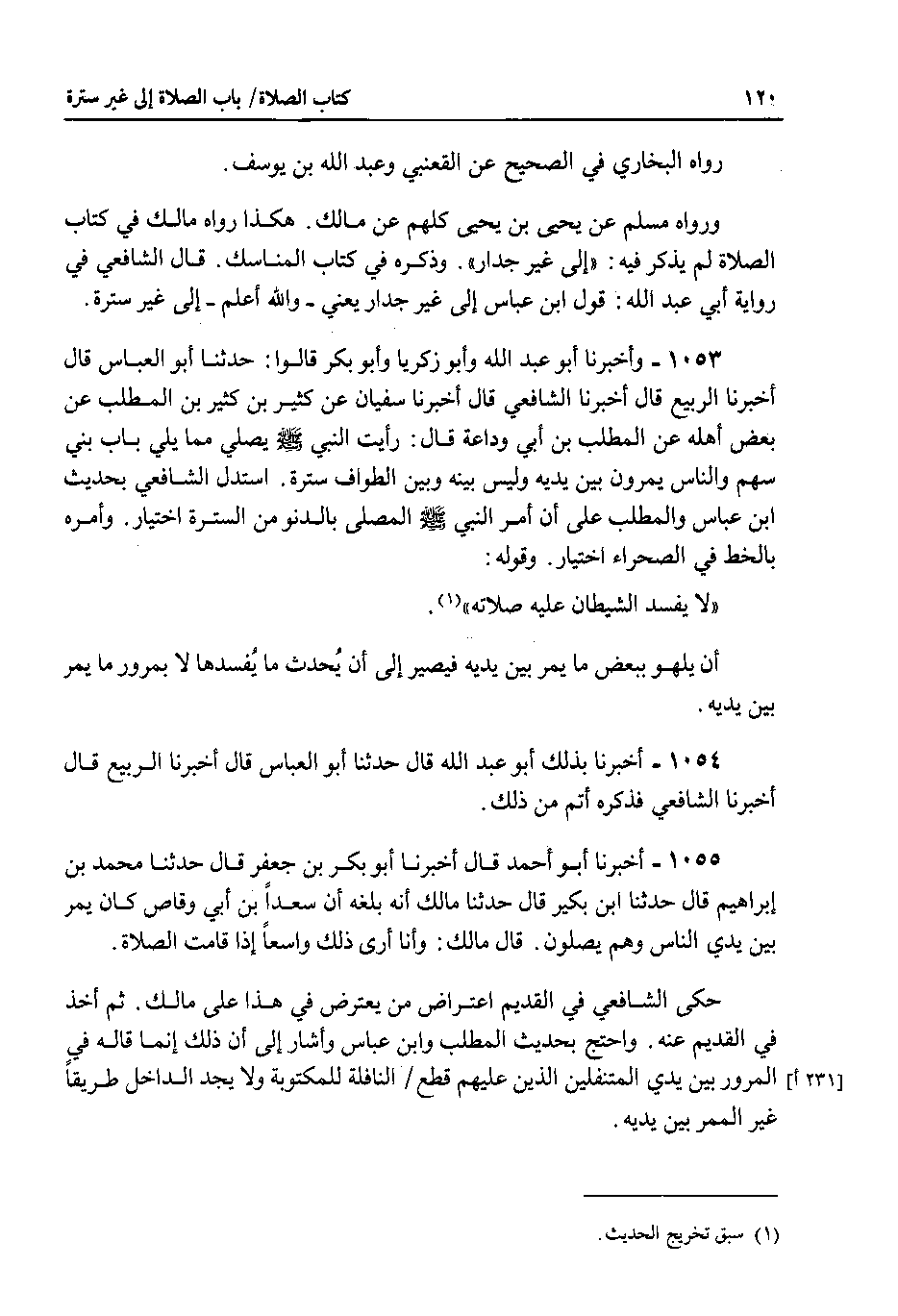 1053 - واخبرنا أبو عبد الله وأبو زكريا وأبو بكر قالوا : حدثنا أبو العباس قال اخبرنا الربيع قال اخبرنا الشافعي قال اخبرنا سفيان عن كثير بن كثير بن المطلب عن بعض أهله عن المطلب بن أبي وداعة قال : رأيت النبي صلى الله عليه وسلم يصلي مما يلي باب بني سهم والناس يمرون بين يديه وليس بينه وبين الطواف سترة . استدل الشافعي بحديث ابن عباس والمطلب على أن أمر النبي صلى الله عليه وسلم المصلي بالدنو من السترة اختيار . وأمره بالخط في الصحراء اختيار . وقوله : لا يفسد الشيطان عليه صلاته أن يلهو ببعض ما يمر بين يديه فيصير إلى أن يحدث ما يفسدها لا بمرور ما يمر بين يديه.