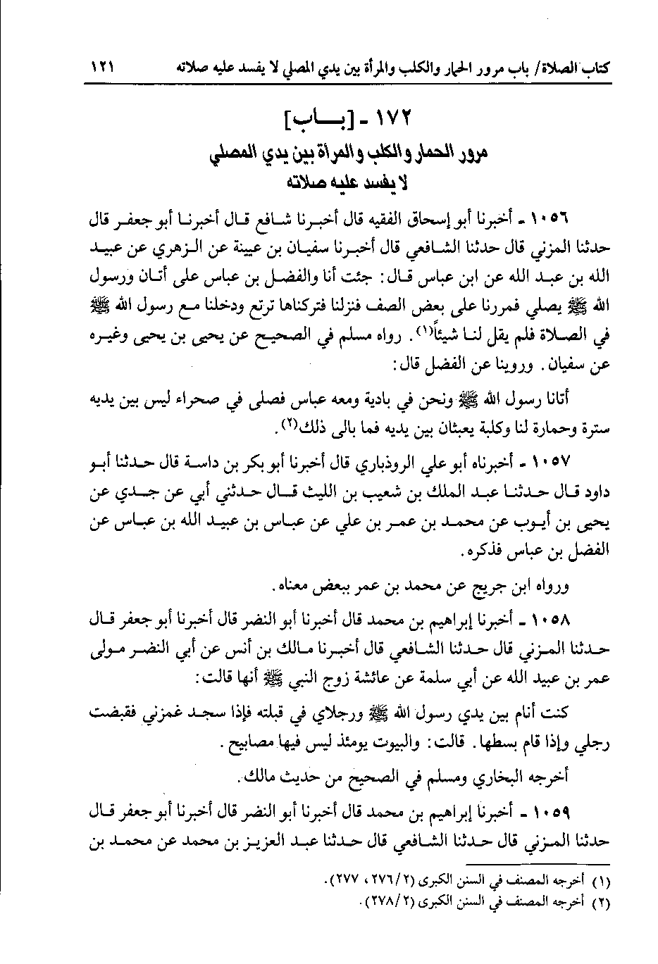 1056 - أخبرنا أبو إسحاق الفقيه قال اخبرنا شافع قال اخبرنا أبو جعفر قال حدثنا المزني قال حدثنا الشافعي قال اخبرنا سفيان بن عيينة عن الزهري عن عبيد الله بن عبد الله عن ابن عباس قال : جئت أنا والفضل بن عباس على أتان ورسول الله صلى الله عليه وسلم يصلي فمررنا على بعض الصف فنزلنا فتركناها ترتع ودخلنا مع رسول الله صلى الله عليه وسلم في الصلاة فلم يقل لنا شيئا . رواه مسلم في الصحيح عن يحيى بن يحيى وغيره عن سفيان . وروينا عن الفضل قال : أتانا رسول الله صلى الله عليه وسلم ونحن في بادية ومعه عباس فصلى في صحراء ليس بين يديه سترة وحمارة لنا وكلبة يعبثان بين يديه فما بالى ذلك.