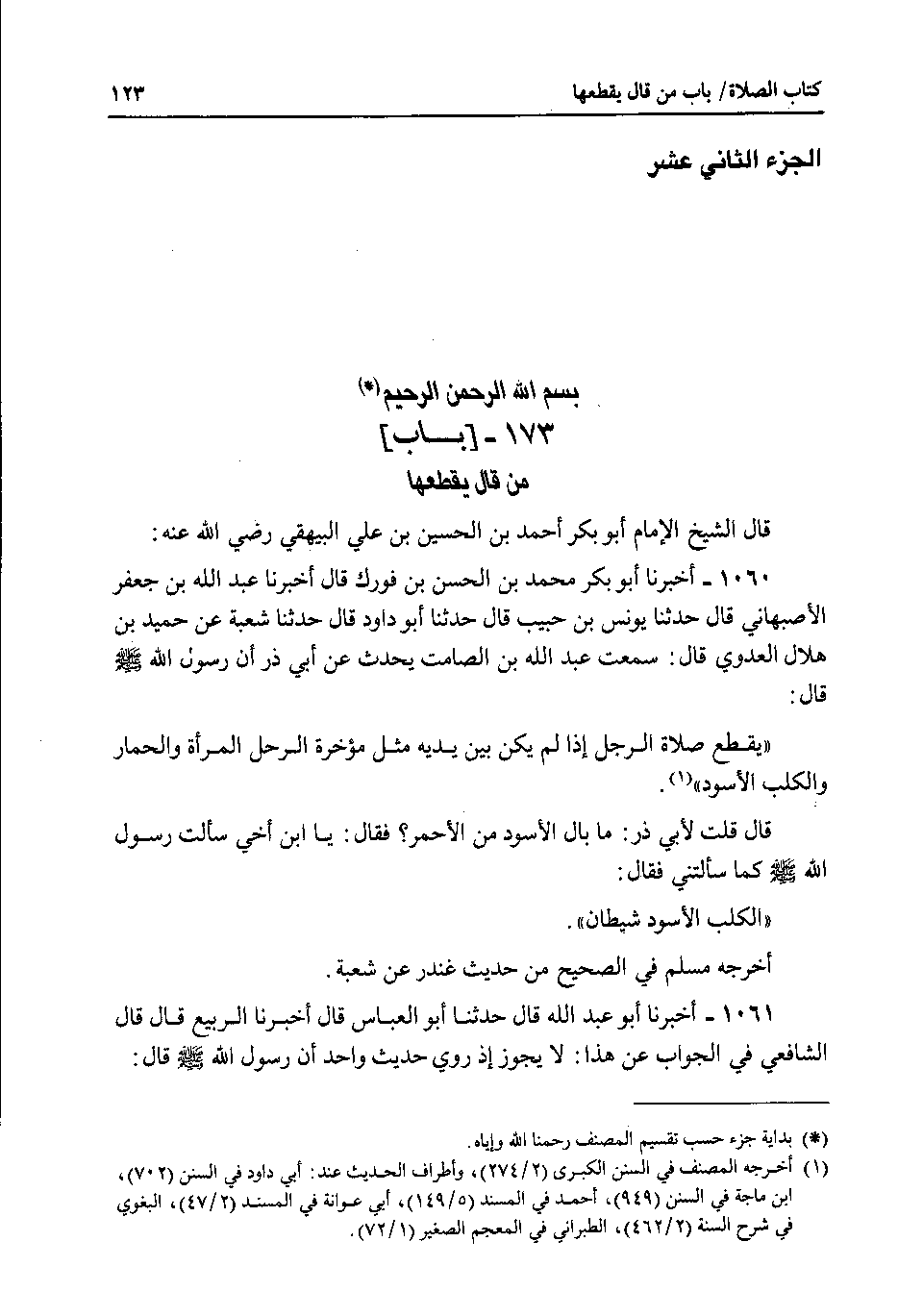 قال الشيخ الإمام أبو بكر أحمد بن الحسين بن علي البيهقي رضي الله عنه 1060 - اخبرنا أبو بكر محمد بن الحسن بن فورك قال اخبرنا عبد الله بن جعفر الأ صبهاني قال حدثنا يونس بن حبيب قال حدثنا أبو داود قال حدثنا شعبة عن حميد بن هلال العدوي قال : سمعت عبد الله بن الصامت يحدث عن أبي ذر أن رسول الله صلى الله عليه وسلم قال : يقطع صلاة الرجل إذا لم يكن بين يديه مثل مؤخرة الرحل المرأة والحمار والكلب الأسود.