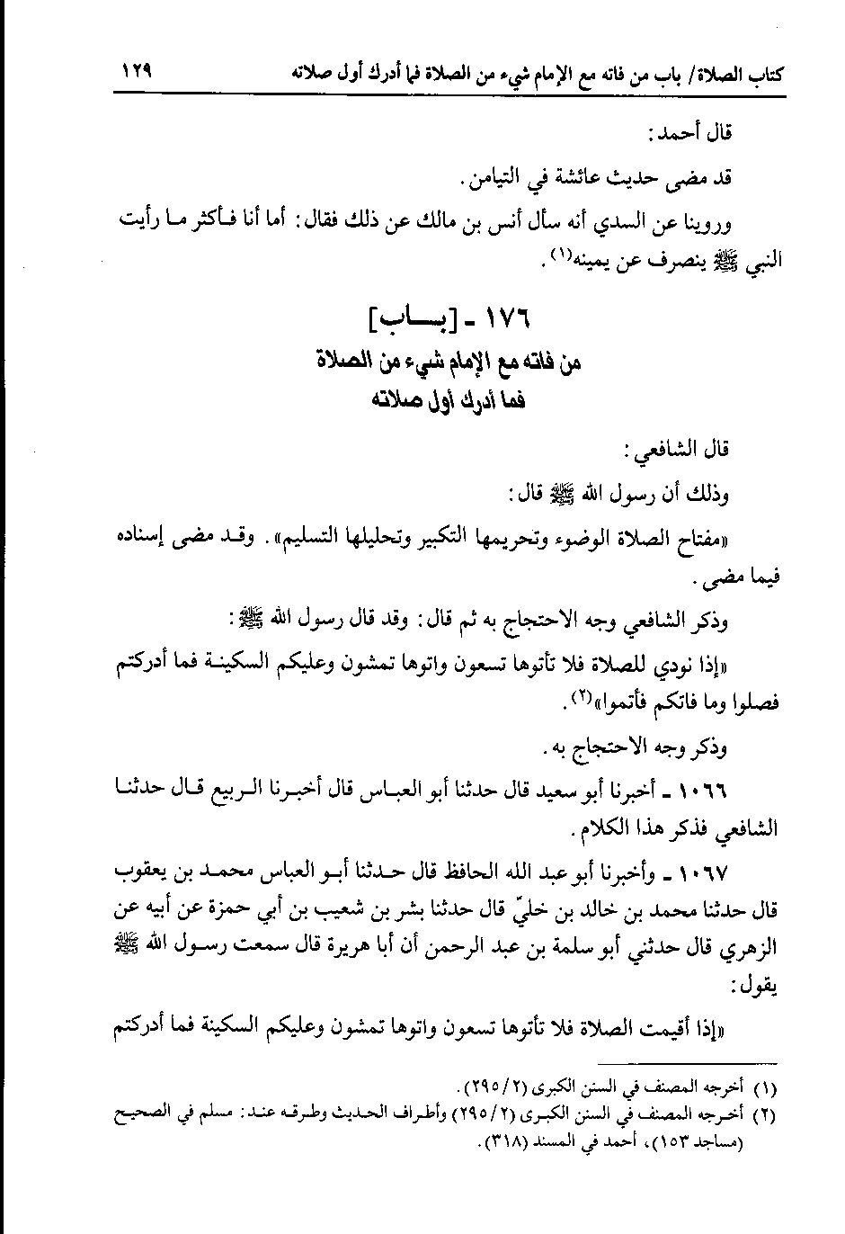 وذكر الشافعي وجه الاحتجاج به ثم قال : وقد قال رسول الله صلى الله عليه وسلم : إذا نودي للصلاة فلا تاتوها تسعون واتوها تمشون وعليكم السكينة فما ادركتم فصلوا وما فاتكم فأتموا.