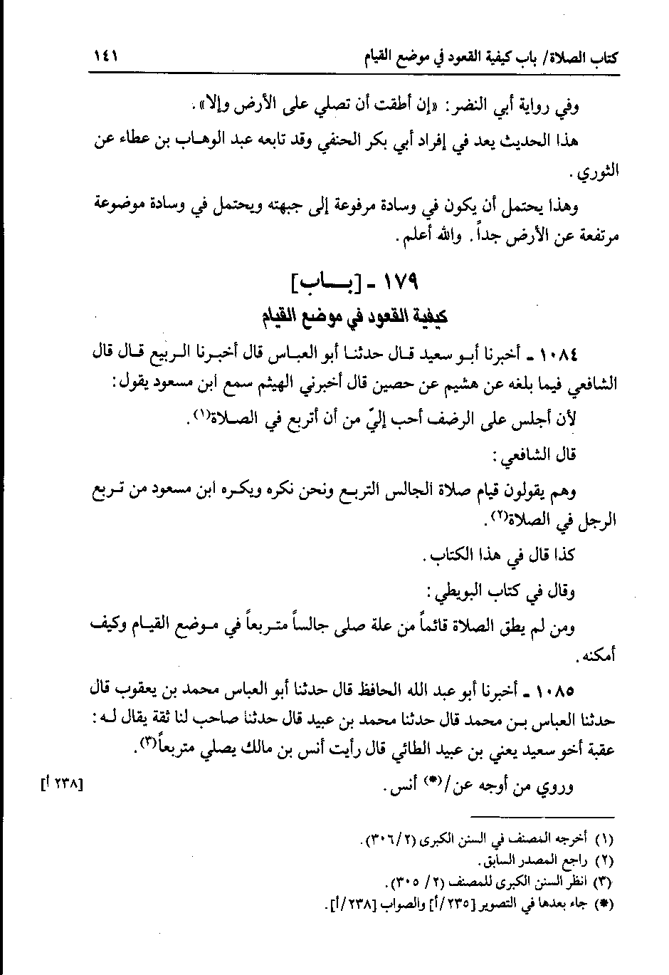 1085 - اخبرنا أبو عبد الله الحافظ قال حدثنا أبو العباس محمد بن يعقوب قال حدثنا العباس بن محمد قال حدثنا محمد بن عبيد قال حدثنا صاحب لنا ثقة يقال له : عقبة أخو سعيد يعني بن عبيد الطائي قال رأيت أنس بن مالك يصلي متربعا.