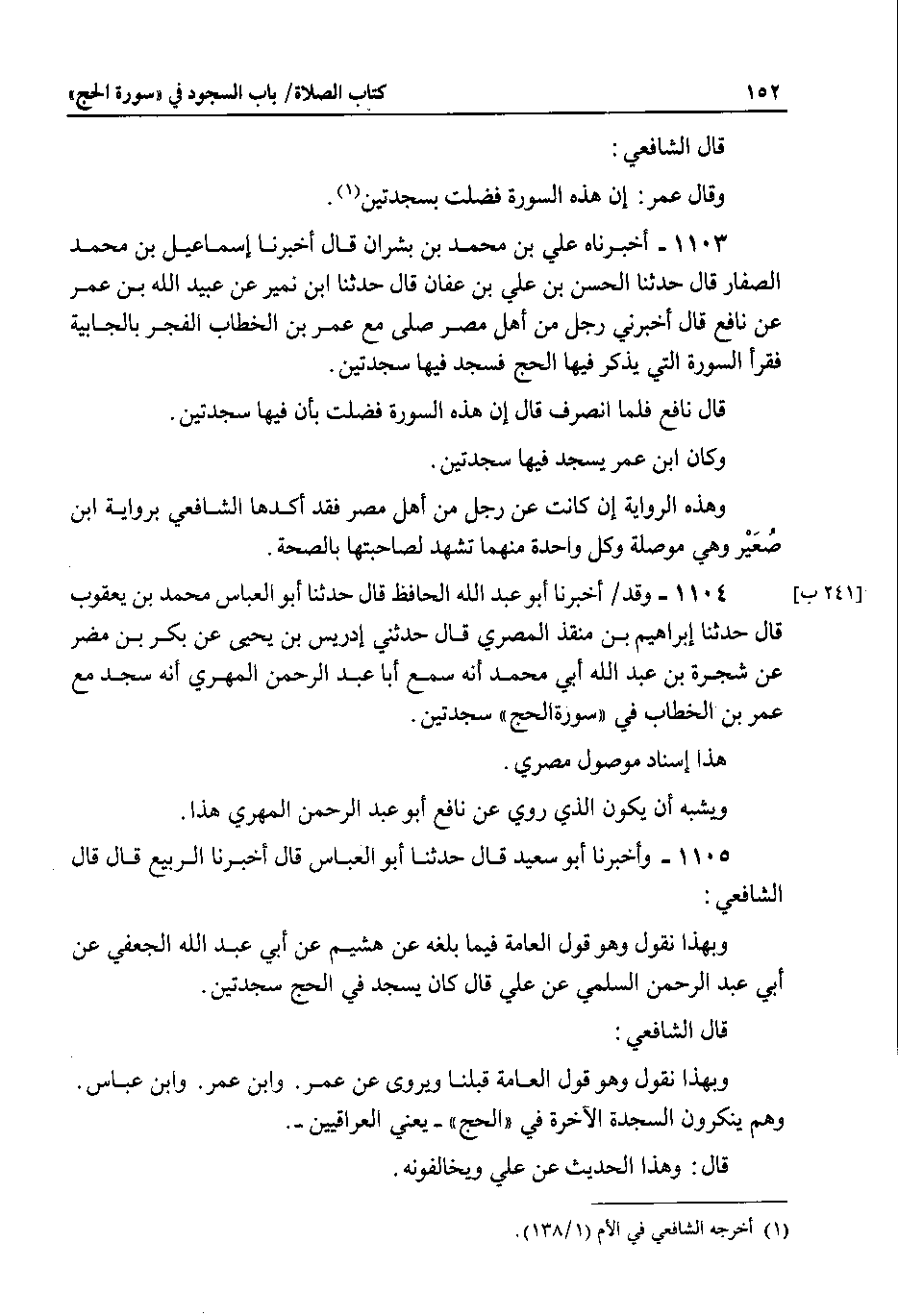 1105 - واخبرنا أبو سعيد قال حدثنا أبو العباس قال اخبرنا الربيع قال قال الشافعي : وبهذا نقول وهو قول العامة فيما بلغه عن هشيم عن أبي عبد الله الجعفي عن أبي عبد الرحمن السلمي عن علي قال كان يسجد في الحج سجدتين.
