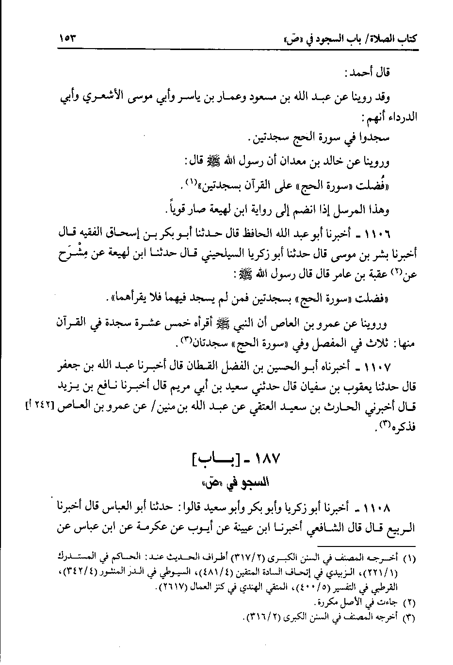 1106 - اخبرنا أبو عبد الله الحافظ قال حدثنا أبو بكر بن إسحاق الفقيه قال اخبرنا بشر بن موسى قال حدثنا أبو زكريا السيلحيني قال حدثنا ابن لهيعة عن مشرح عن عقبة بن عامر قال قال رسول الله صلى الله عليه وسلم : فضلت سورة الحج بسجدتين فمن لم يسجد فيهما فلا يقرأهما وروينا عن عمرو بن العاص أن النبي صلى الله عليه وسلم أقرأه خمس عشرة سجدة في القرآن منها : ثلاثة في المفصل وفي سورة الحج سجدتان.