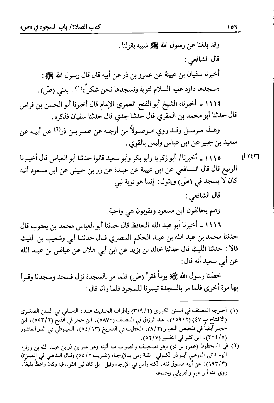 1115 - أخبرنا أبو زكريا وأبو بكر وأبو سعيد قالوا حدثنا أبو العباس قال اخبرنا الربيع قال قال الشافعي عن ابن عيينة عن عبدة عن زر بن حبيش عن ابن مسعود انه كان لا يسجد في ( ص~ ) ويقول : إنما هو توبة نبي.