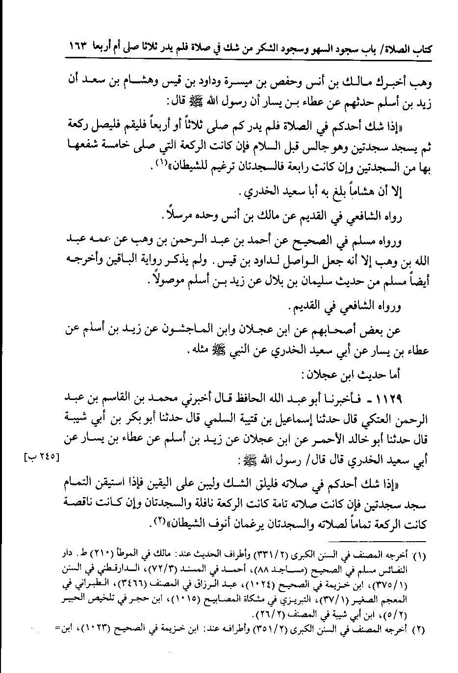 أما حديث ابن عجلان 1129 - فأخبرنا أبو عبد الله الحافظ قال اخبرني محمد بن القاسم بن عبد الرحمن العتكي قال حدثنا إسماعيل بن قتيبة السلمي قال حدثنا أبو بكر بن أبي شيبة قال حدثنا أبو خالد الأحمر عن ابن عجلان عن زيد بن اسلم عن عطاء بن يسار عن أبي سعيد الخدري قال قال رسول الله صلى الله عليه وسلم : إذا شك أحدكم في صلاته فليلق الشك وليبن على اليقين فإذا استيقن التمام سجد سجدتين فإن كانت صلاته تامة كانت الركعة نافلة والسجدتان وإن كانت ناقصة كانت الركعة تماما لصلاته والسجدتان يرغمان انوف الشيطان.