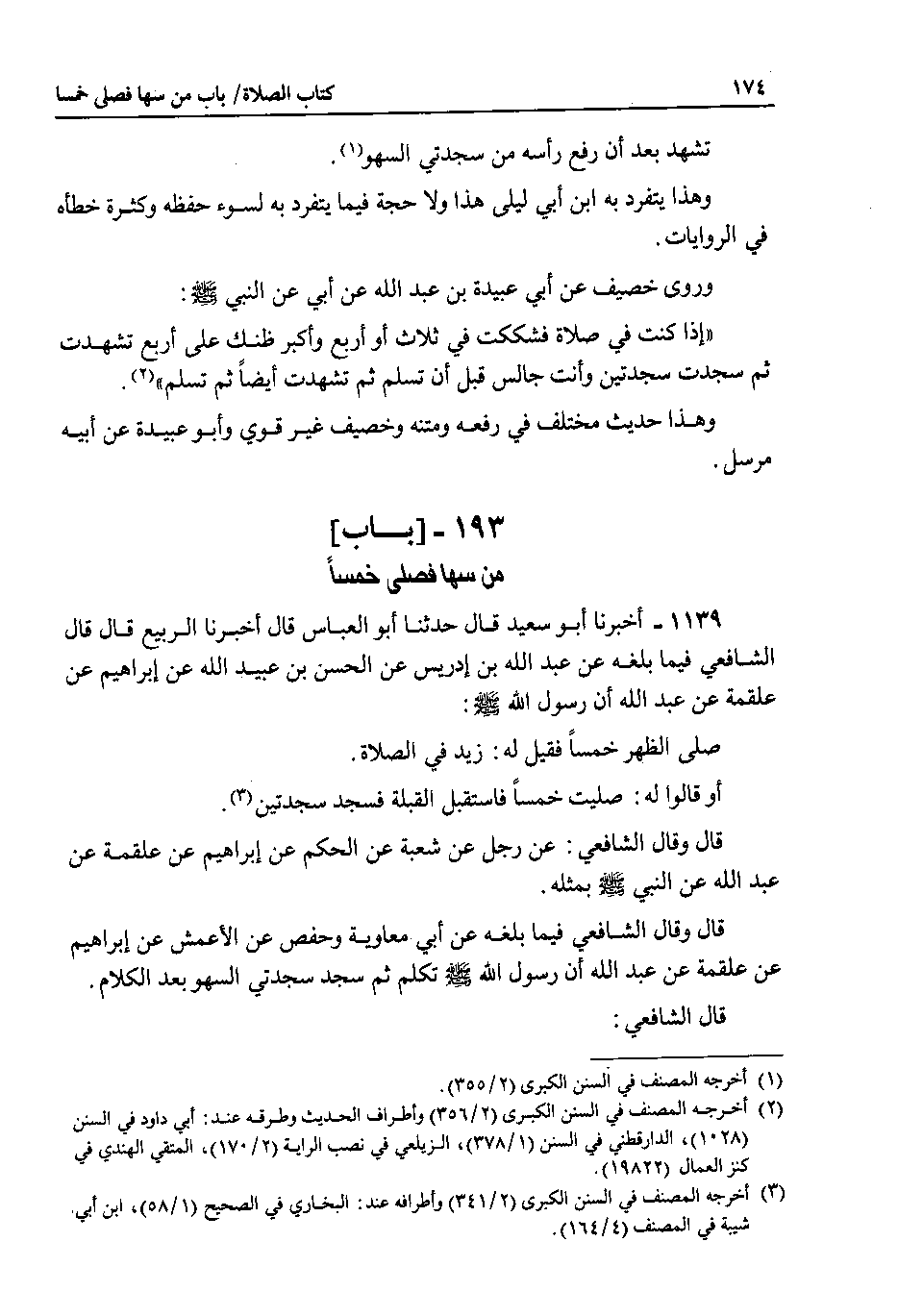 1139 - اخبرنا أبو سعيد قال حدثنا أبو العباس قال اخبرنا الربيع قال قال الشافعي فيما بلغه عن عبد الله بن إدريس عن الحسن بن عبيد الله عن إبراهيم عن علقمة عن عبد الله أن رسول الله صلى الله عليه وسلم : صلى الظهر خمسا فقيل له : زيد في الصلاة.