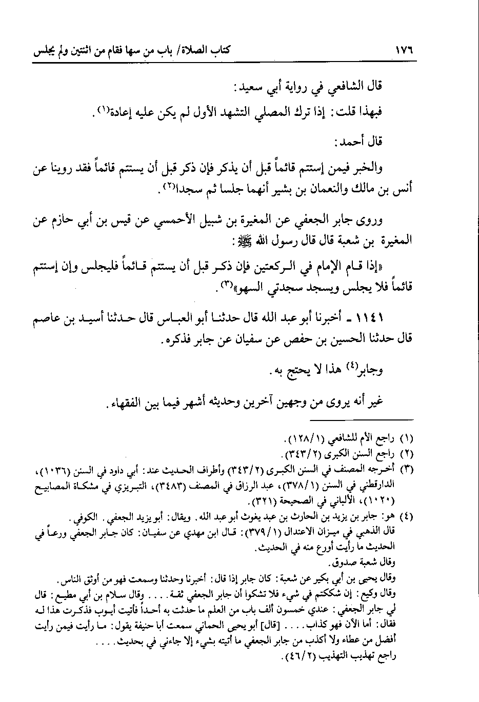 وروى جابر الجعفي عن المغيرة بن شبيل الأحمسي عن قيس بن أبي حازم عن المغيرة بن شعبة قال قال رسول الله صلى الله عليه وسلم : إذا قام الإمام في الركعتين فإن ذكر قبل أن يستتم قائما فليجلس وإن استتم قائما فلا يجلس ويسجد سجدتي السهو.
