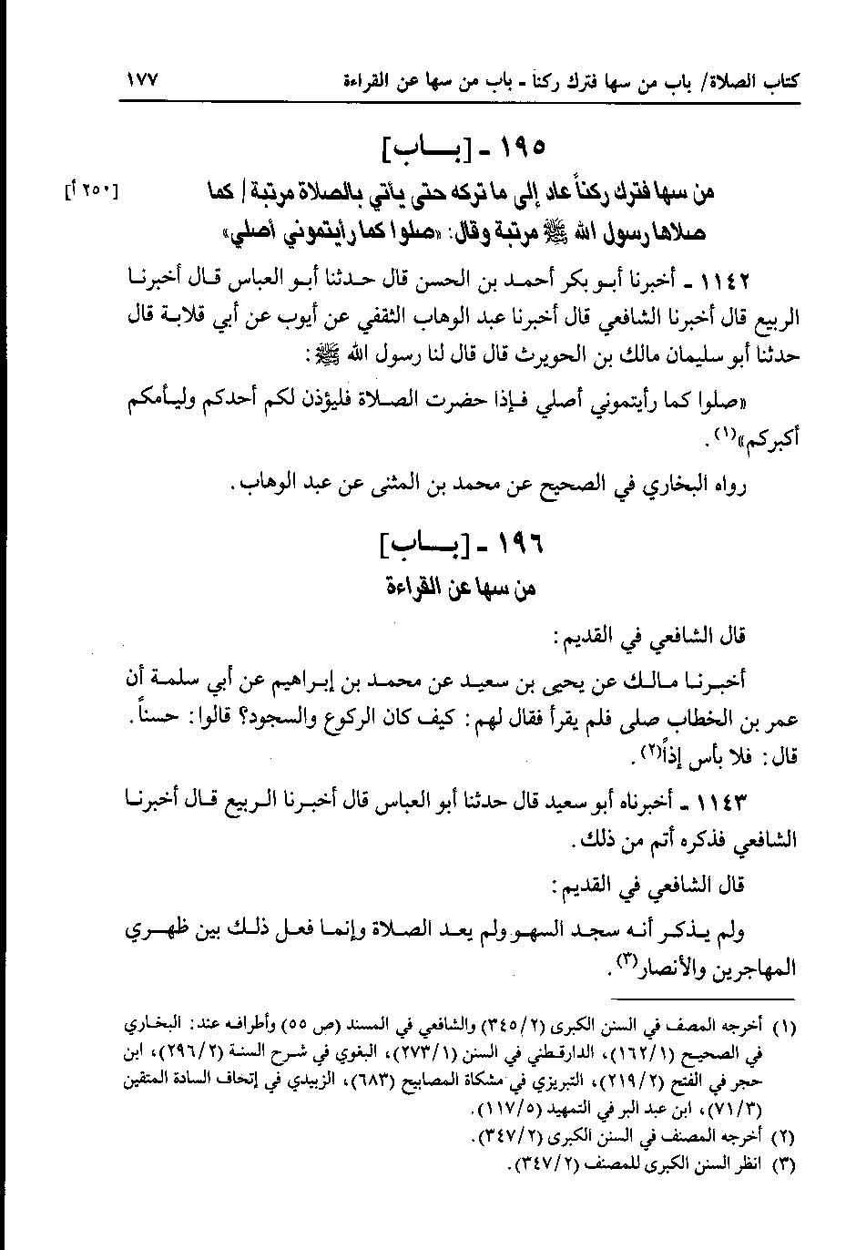 قال الشاقعي في القديم ولم يذكر انه سجد السهو ولم يعد الصلاة وإنما فعل ذلك بين ظهري المهاجرين والأنصار.