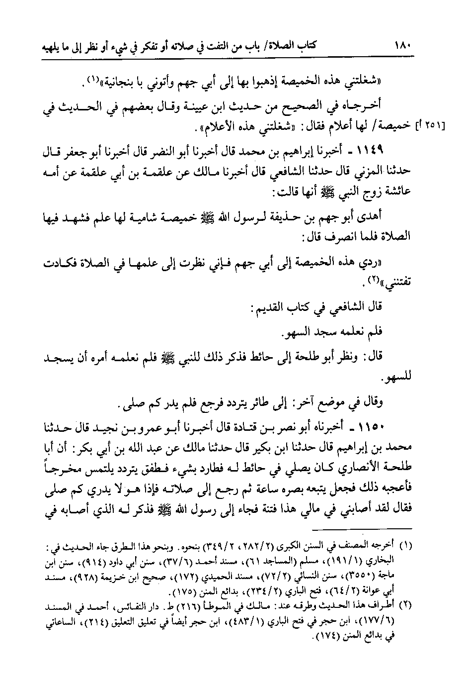1149 - اخبرنا إبراهيم بن محمد قال اخبرنا أبو النضر قال اخبرنا أبو جعفر قال حدثنا المزني قال حدثنا الشافعي قال اخبرنا مالك عن علقمة بن أبي علقمة عن أمه عائشة زوج النبي صلى الله عليه وسلم انها قالت : أهدى أبو جهم بن حذيفة لرسول الله صلى الله عليه وسلم خميصة شامية لها علم فشهد فيها الصلاة فلما انصرف قال : ردي هذه الخميصة إلى أبي جهم فإني نظرت إلى علمها في الصلاة فكادت تفتنني.