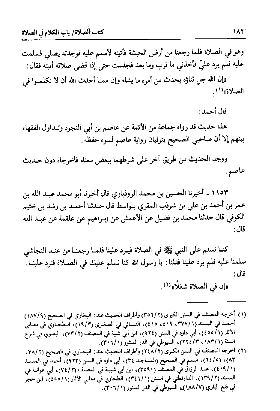 1153 - اخبرنا الحسين بن محمد الروذباري قال اخبرنا أبو محمد عبد الله بن عمر بن أحمد بن علي بن شوذب المقري بواسط قال حدثنا أحمد بن رشد بن خثيم الكوفي قال حدثنا محمد بن فضيل عن الأعمش عن إبراهيم عن علقمة عن عبد الله قال : كنا نسلم على النبي صلى الله عليه وسلم في الصلاة فيرد علينا فلما رجعنا من عند النجاشي سلمنا عليه فلم يرد علينا فقلنا : يا رسول الله كنا نسلم عليك في الصلاة فترد علينا.