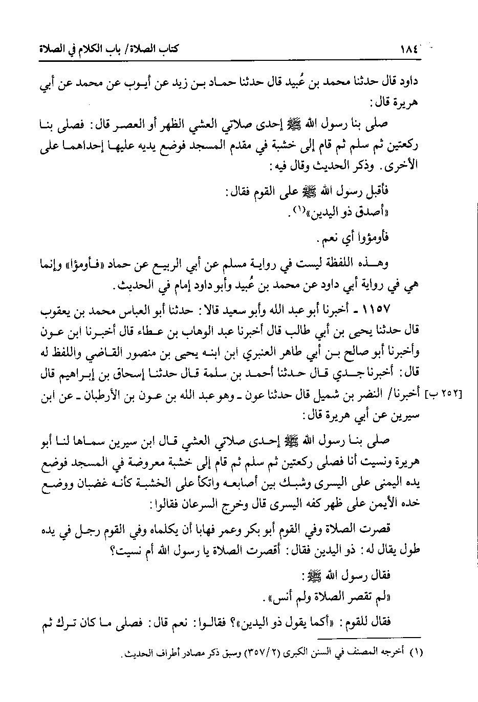 1157 - أخبرنا أبو عبد الله وأبو سعيد قالا : حدثنا أبو العباس محمد بن يعقوب قال حدثنا يحيى بن أبي طالب قال اخبرنا عبد الوهاب بن عطاء قال اخبرنا ابن عون واخبرنا أبو صالح بن أبي طاهر العنبري ابن ابنه يحيى بن منصور القاضي واللفظ له قال : اخبرنا جدي قال حدثنا أحمد بن سلمة قال حدثنا إسحاق بن إبراهيم قال اخبرنا النضر بن شميل قال حدثنا عون - وهو عبد الله بن عون بن الأرطبان - عن ابن سيرين عن أبي هريرة قال : صلى بنا رسول الله صلى الله عليه وسلم إحدى صلاتي العشي قال ابن سيرين سماها لنا أبو هريرة ونسيت أنا فصلى ركعتين ثم سلم ثم قام إلى خشبة معروضة في المسجد فوضع يده اليمنى على اليسرى وشبك بين أصابعه واتكأ على الخشبة كأنه غضبان ووضع خده الأيمن على ظهر كفه اليسرى قال وخرج السرعان فقالوا : قصرت الصلاة وفي القوم أبو بكر وعمر فهابا أن يكلماه وفي القوم رجل في يده طول يقال له : ذو اليدين فقال : اقصرت الصلاة يا رسول الله أم نسيت ؟ فقال رسول الله صلى الله عليه وسلم : لم تقصر الصلاة ولم أنس.