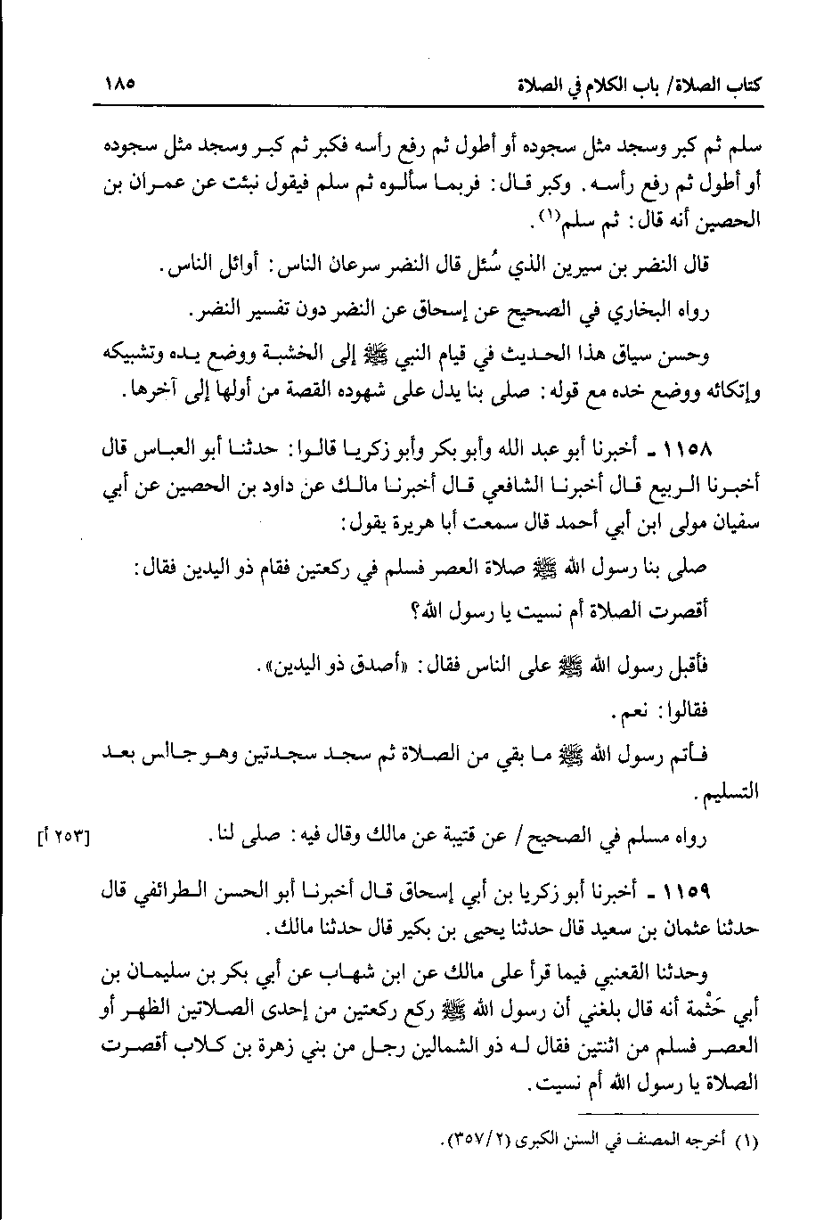 1158 - اخبرنا أبو عبد الله وأبو بكر وأبو زكريا قالوا : حدثنا أبو العباس قال اخبرنا الربيع قال اخبرنا الشافعي قال أخبرنا مالك عن داود بن الحصين عن أبي سفيان مولى ابن أبي أحمد قال سمعت أبا هريرة يقول : صلى بنا رسول الله صلى الله عليه وسلم صلاة العصر فسلم في ركعتين فقام ذو اليدين فقال : اقصرت الصلاة أم نسيت يا رسول الله ؟ فأقبل رسول الله صلى الله عليه وسلم على الناس فقال : أصدق ذو اليدين.