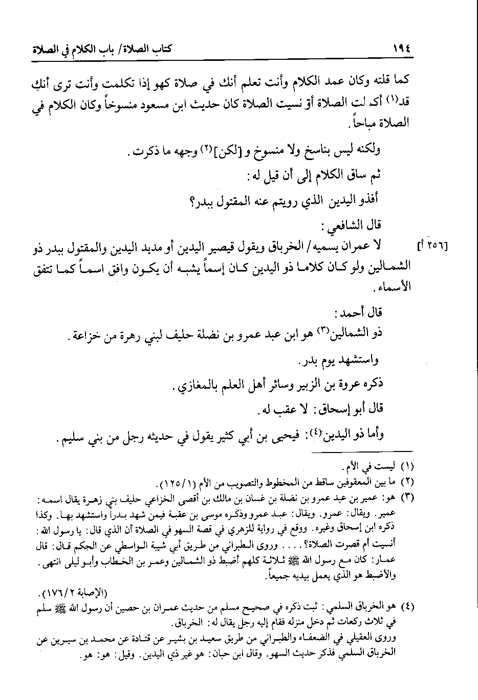 ثم ساق الكلام إلى أن قيل له : أفذو اليدين الذي رويتم عنه المقتول ببدر ؟ قال الشافعي : لا عمران يسميه الخرباق ويقول قيصير اليدين أو مديد اليدين والمقتول ببدر ذو الشمالين ولو كان كلاما ذو اليدين كان اسما يشبه أن يكون وافق اسما كما تتفق الأسماء.